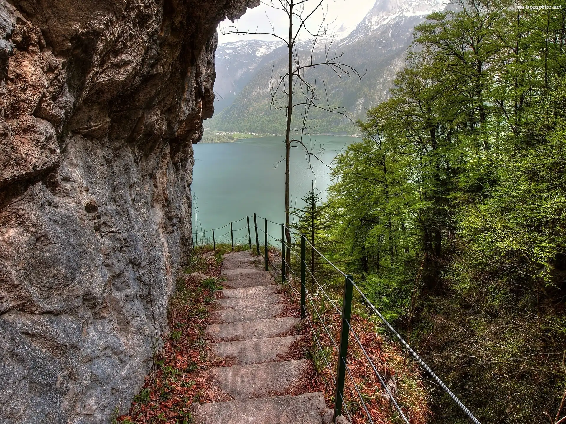 Zejście, Góry, Jezioro, Skała, Schody na Komórkę