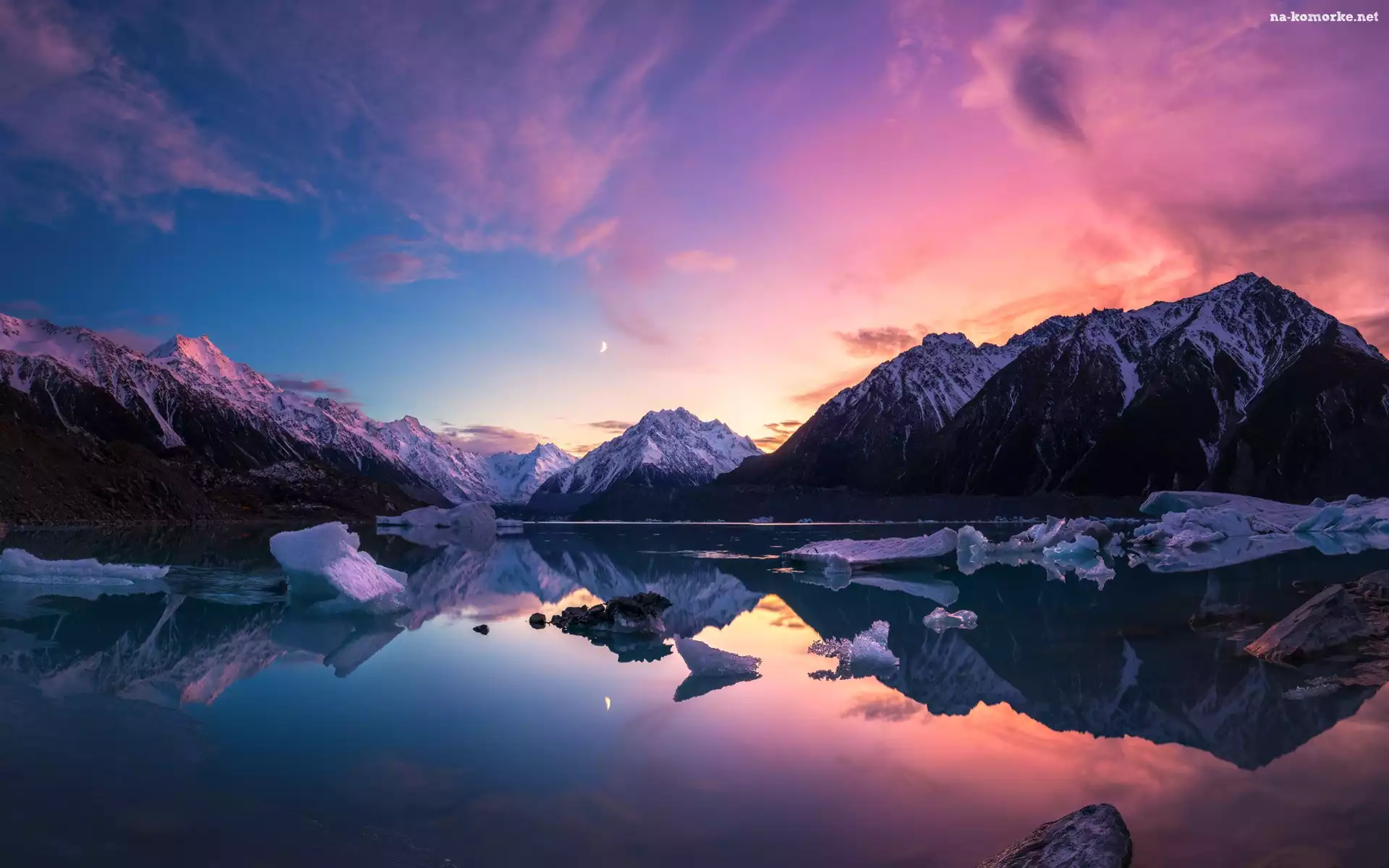 Tasman Lake, Zachód słońca, Góra Cooka, Nowa Zelandia, Lód, Park Narodowy Góry Cooka, Góry, Jezioro na Komórkę |