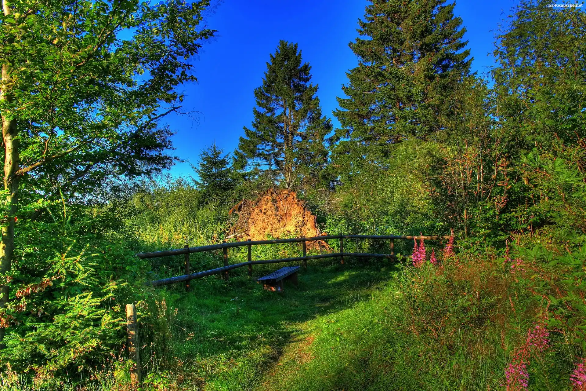 Zieleń, Drzewa, Płot, Ławka, Zakątek na Komórkę
