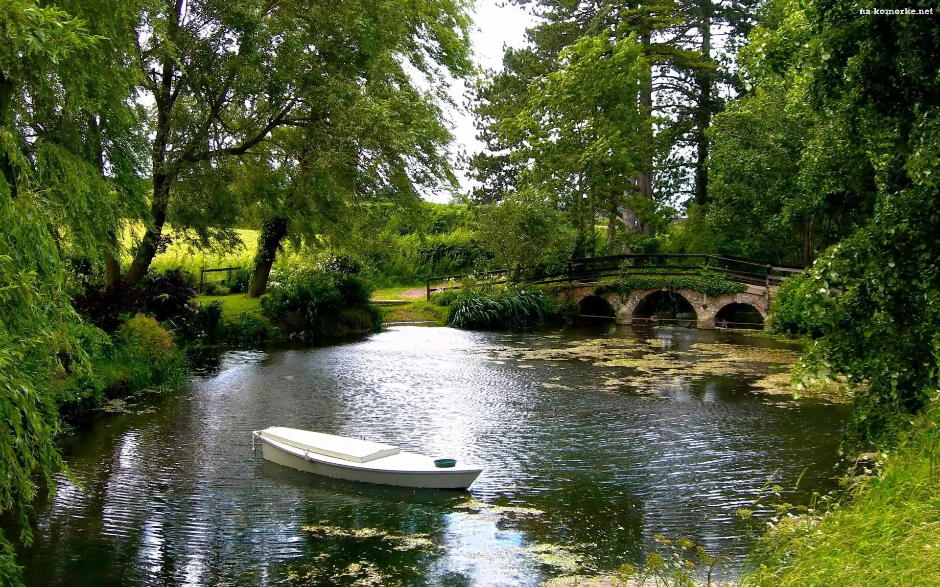 Zieleń, Stawek, Mostek, Drzewa, Łódka na Komórkę