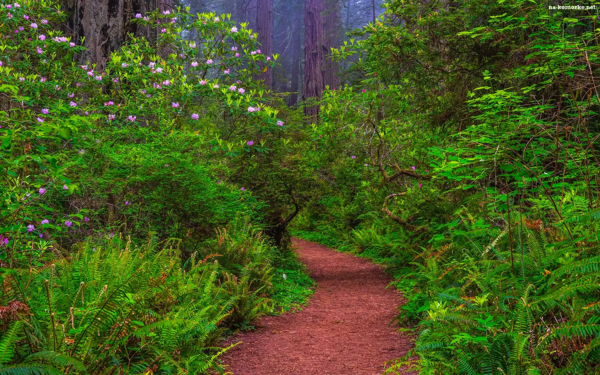 Ścieżka, Paprocie, Kalifornia, Zielone, Park Narodowy Redwood, Stany Zjednoczone, Sekwoje, Różaneczniki, Las, Mgła na Komórkę |