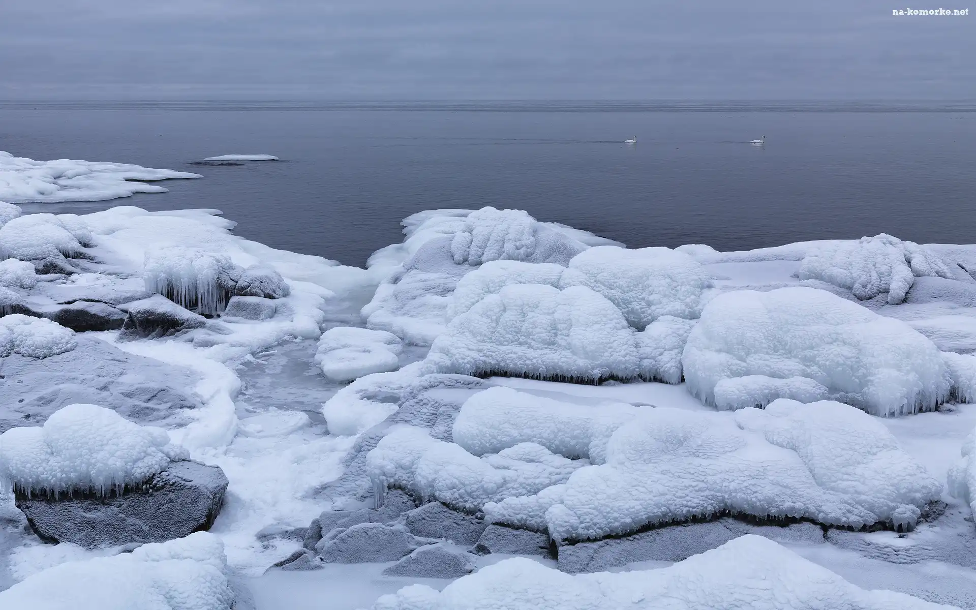 Zima, Morze, Kamienie, Brzeg, Kaczki na Komórkę
