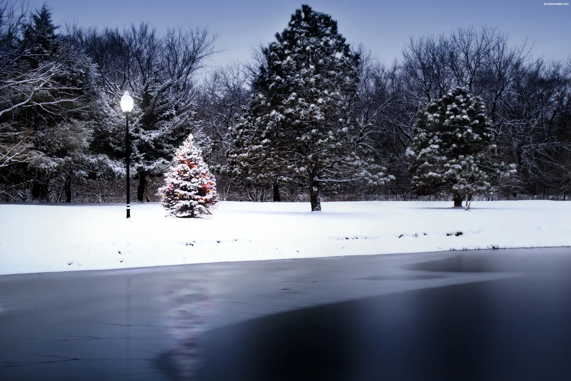 Zima, Jezioro, Choinka, Zamarznięte na Komórkę