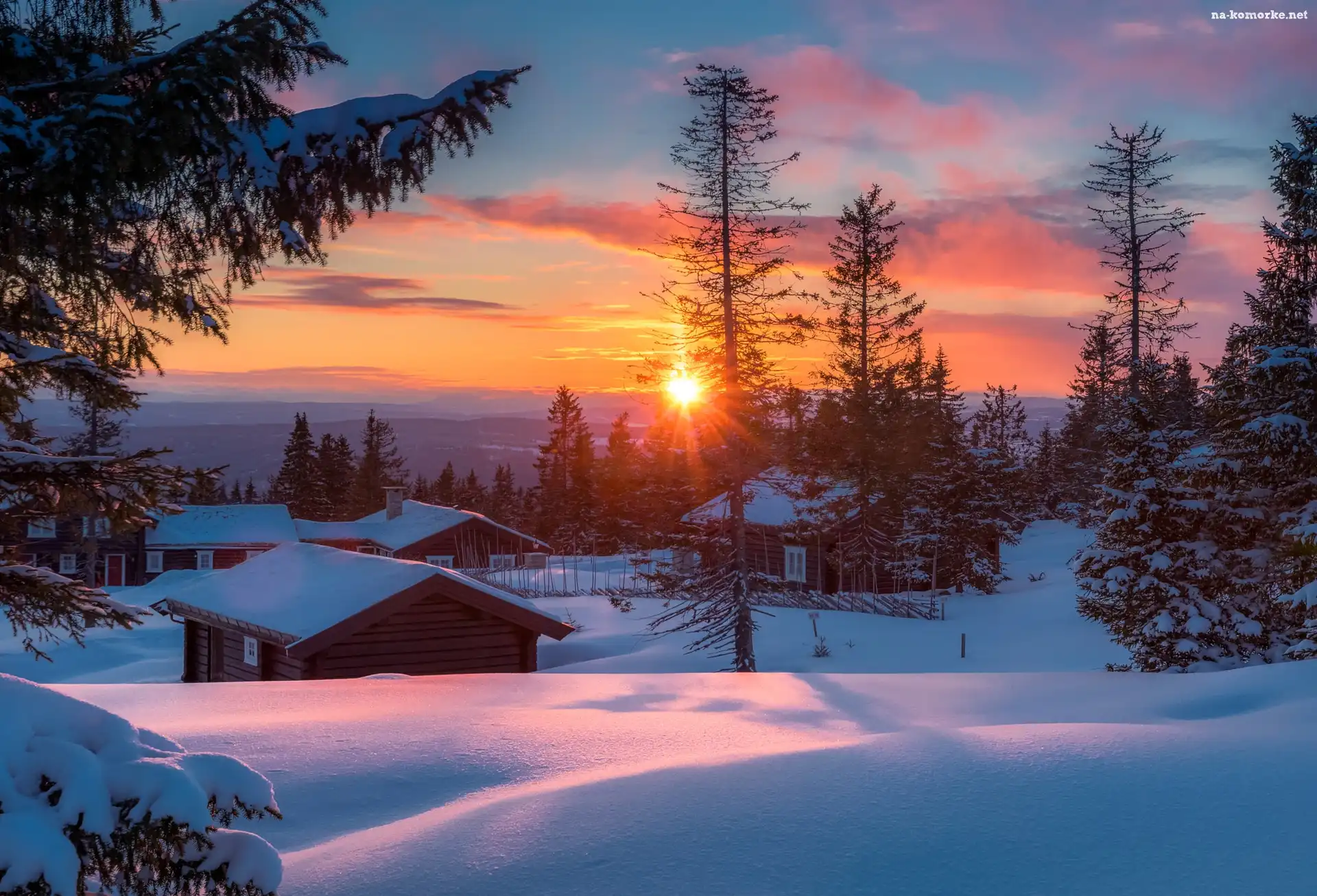 Zima, Zachód słońca, Domy, Drzewa na Komórkę