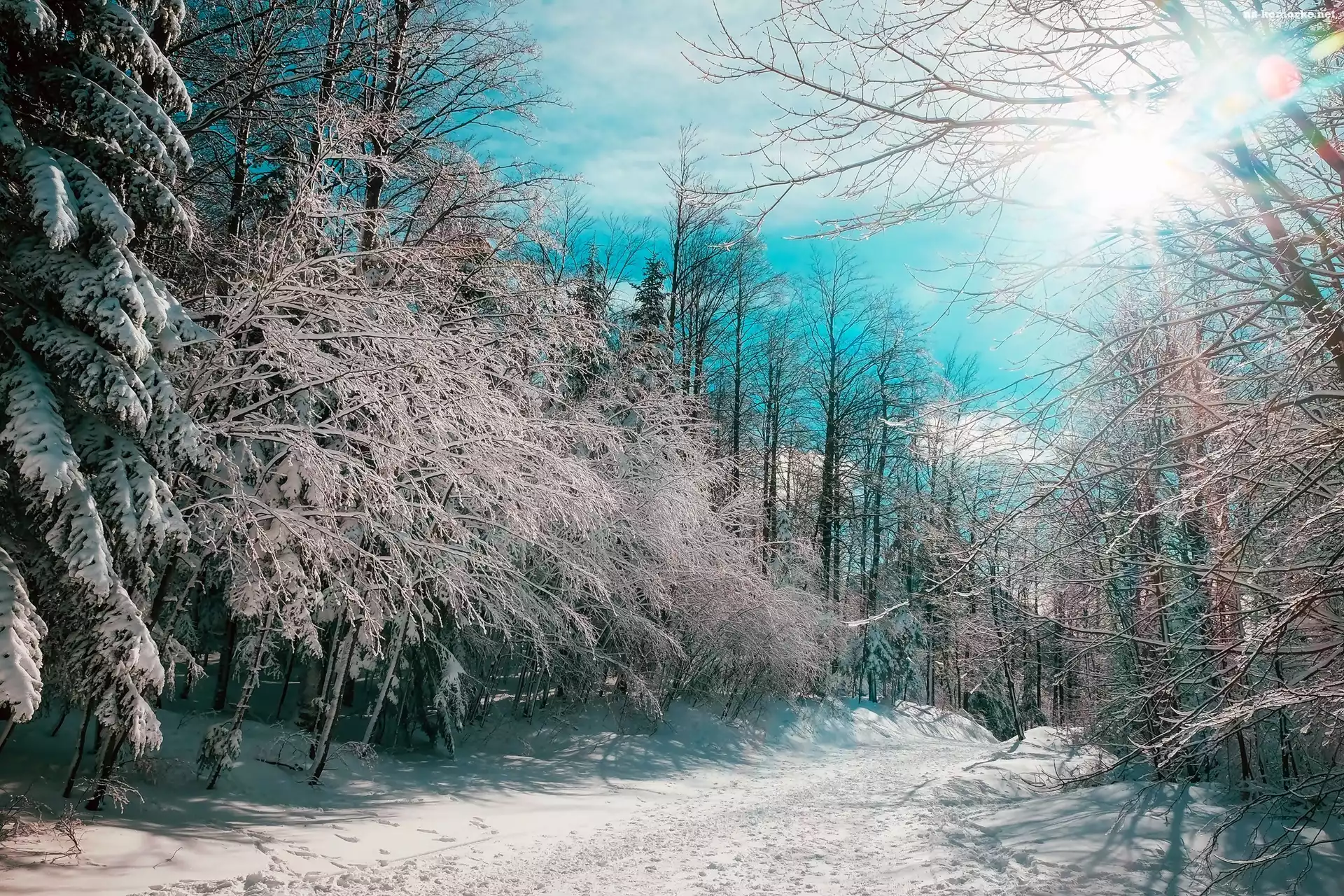 Zima, Promienie słońca, Droga, Las na Komórkę