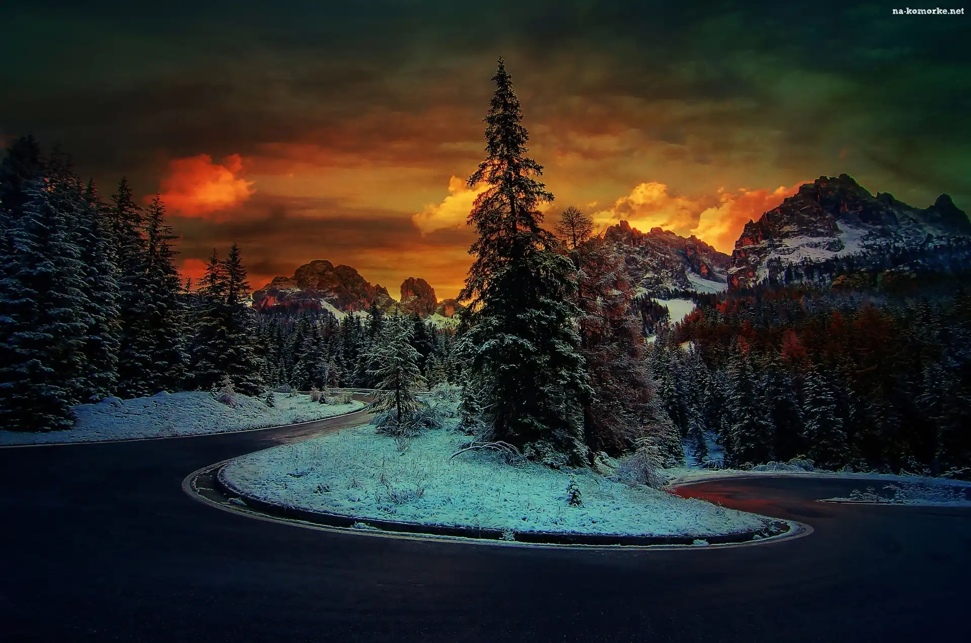 Zima, Zachód Słońca, Droga, Góry na Komórkę