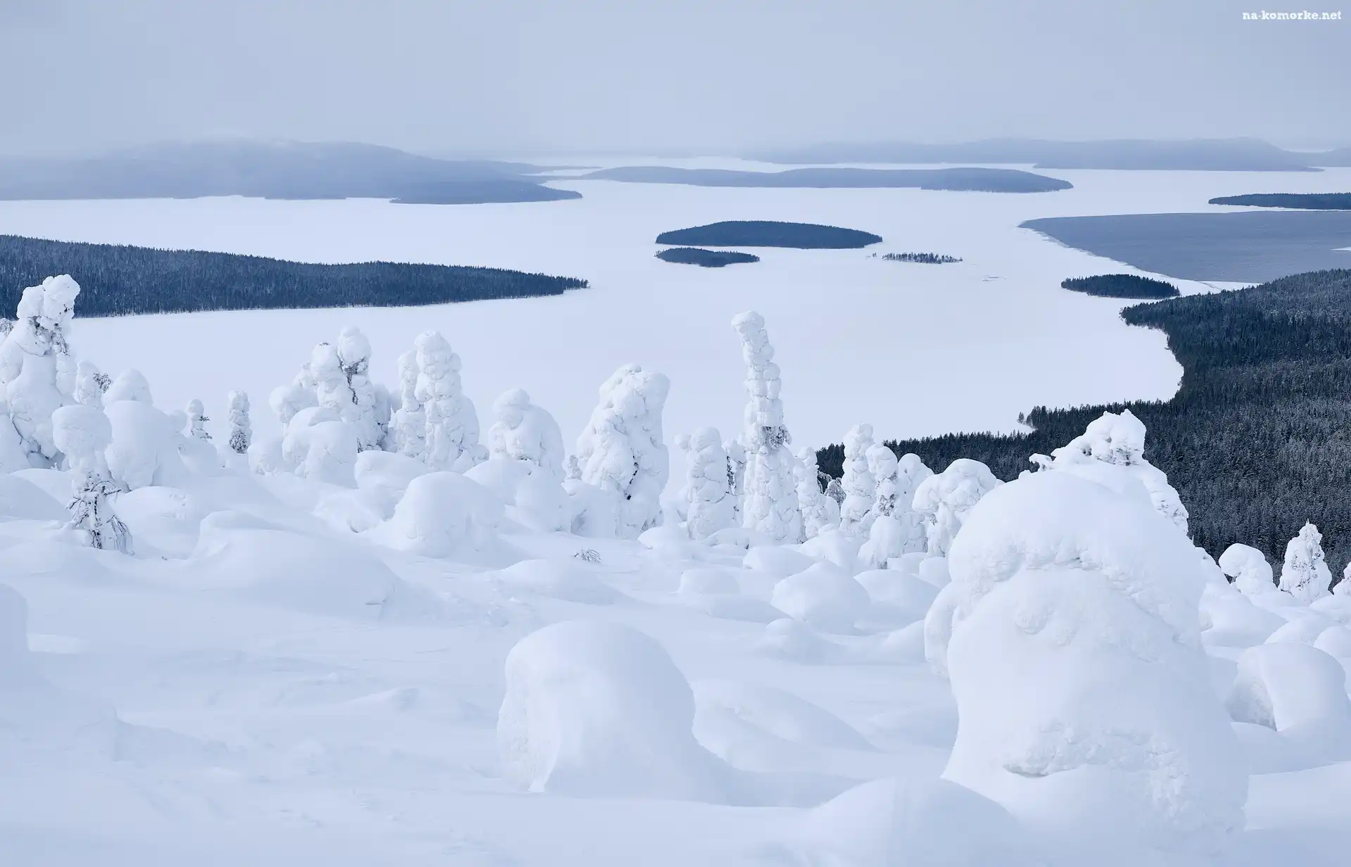 Zima, Jezioro, Drzewa, Góry na Komórkę