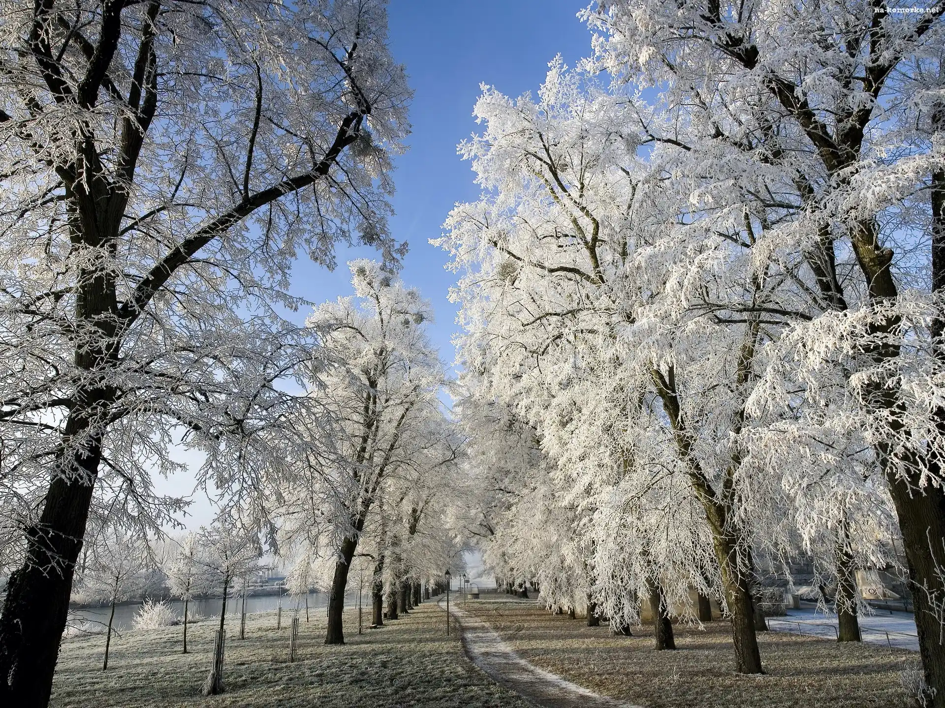 Zima, Park, Rzeka, Drzewa, Ścieżka na Komórkę