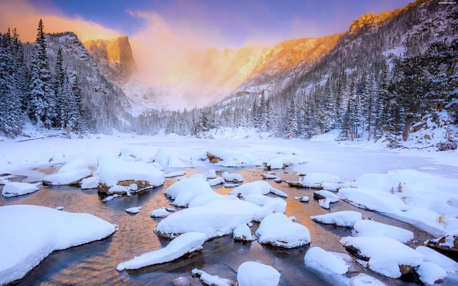 Zima, Zachód Słońca, Góry, Drzewa, Rzeka na Komórkę