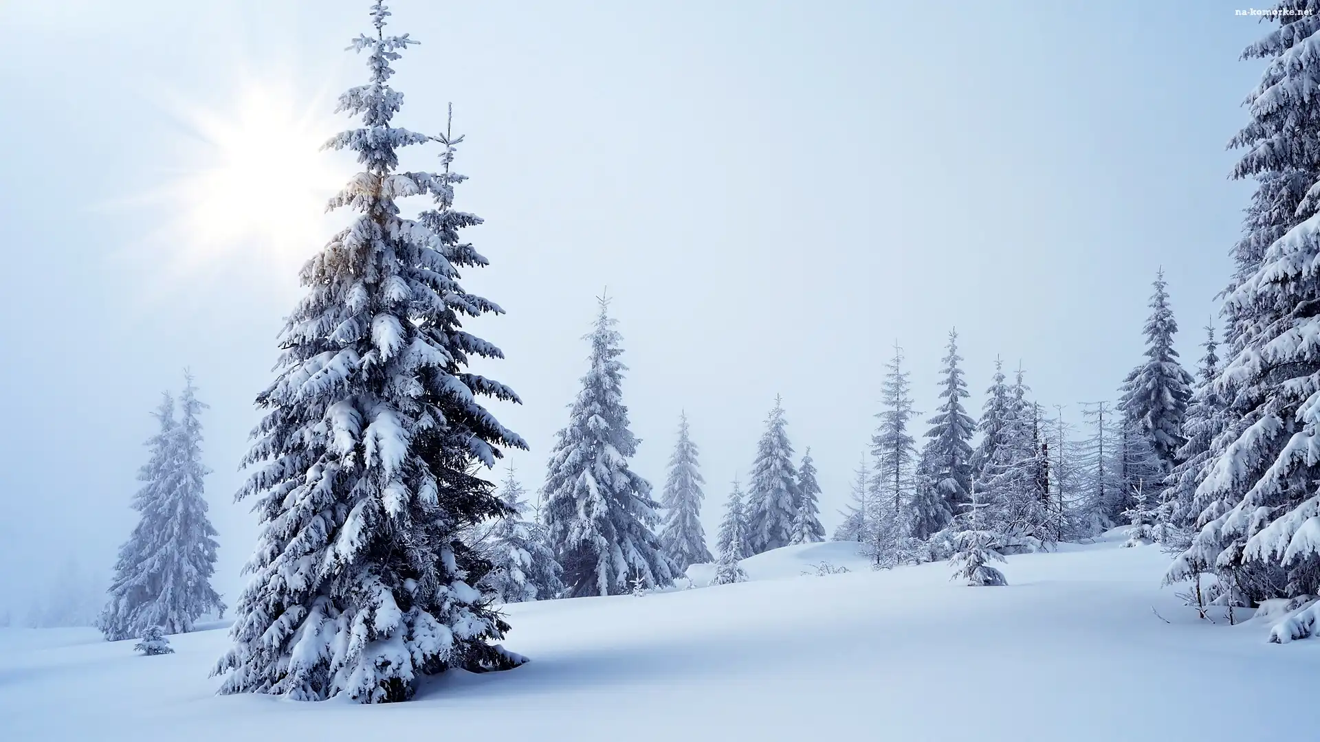 Zima, Promienie słońca, Drzewa, Świerki na Komórkę