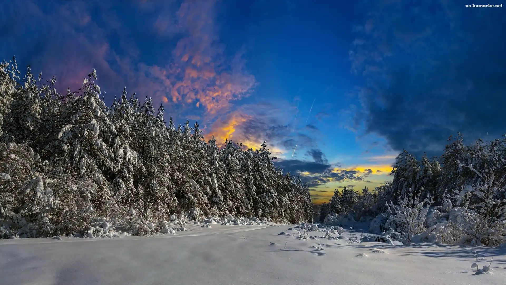 Zima, Zachód słońca, Drzewa, Śnieg na Komórkę