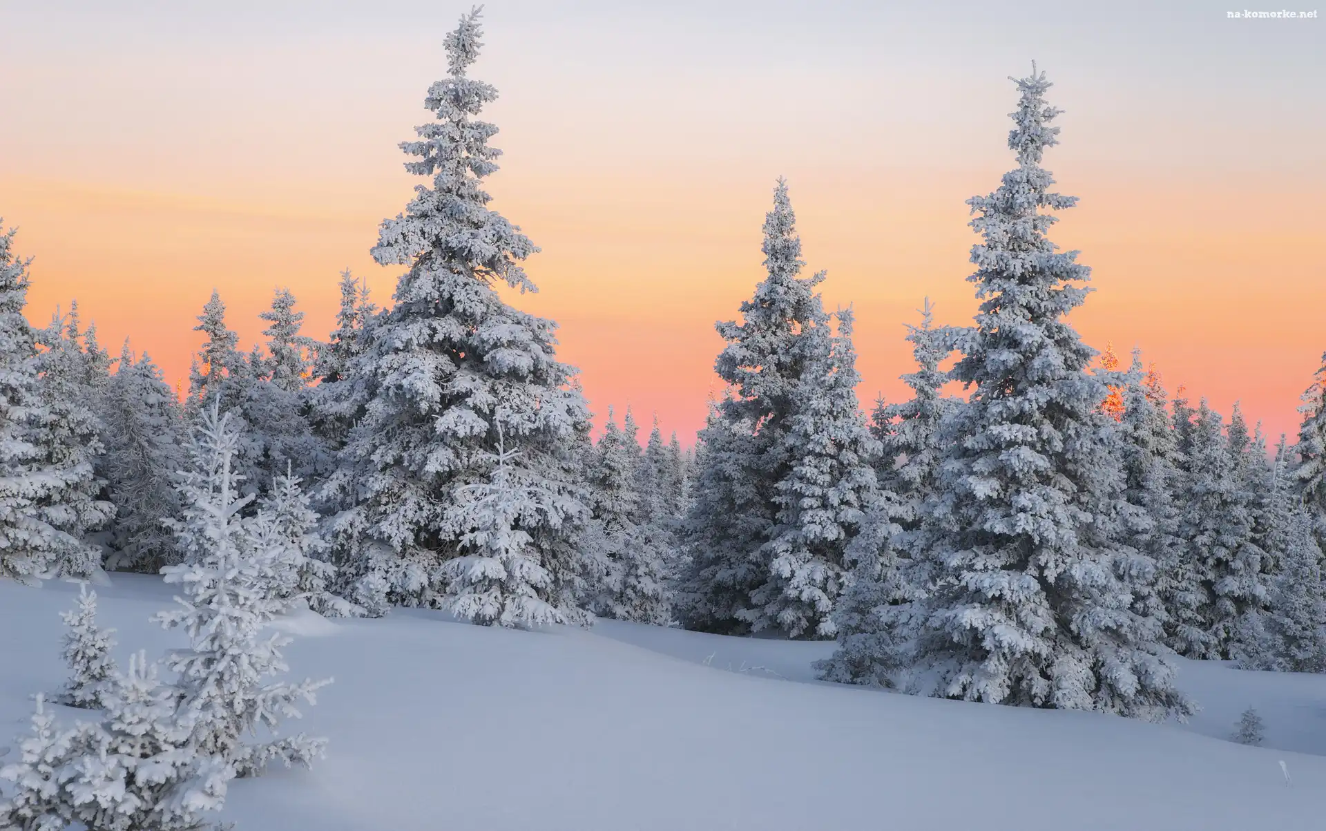 Zima, Zachód słońca, Drzewa, Świerki na Komórkę