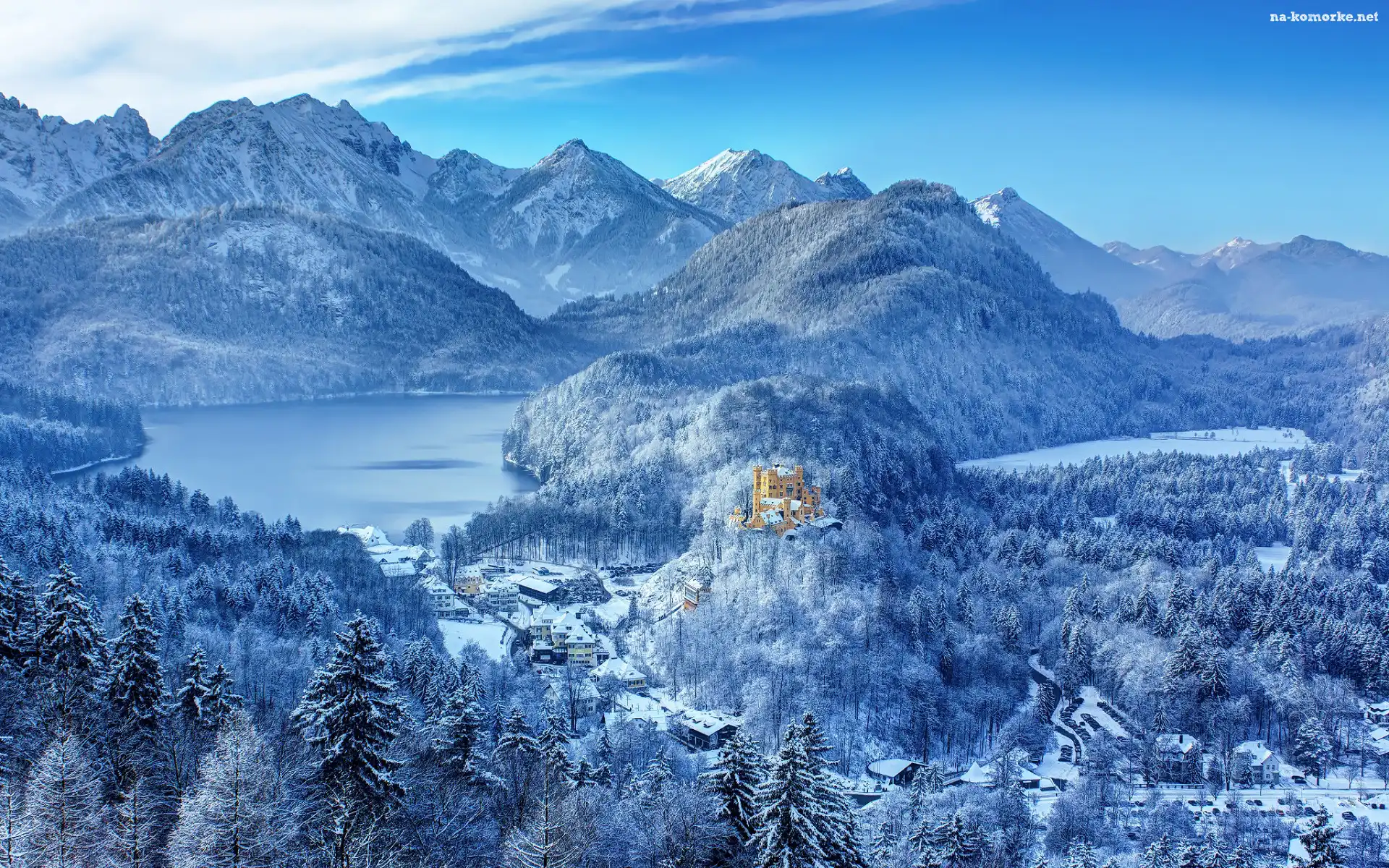 Zima, Śnieg, Niemcy, Drzewa, Bawaria, Zamek Hohenschwangau, Lasy, Góry, Jezioro Alpsee, Jezioro Schwan na Komórkę |