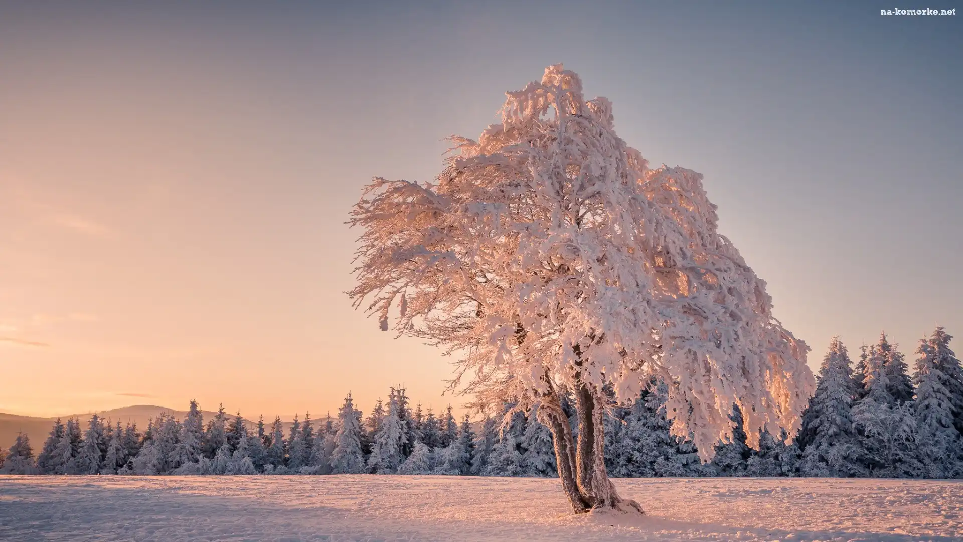 Zima, Zachód słońca, Drzewo, Las na Komórkę