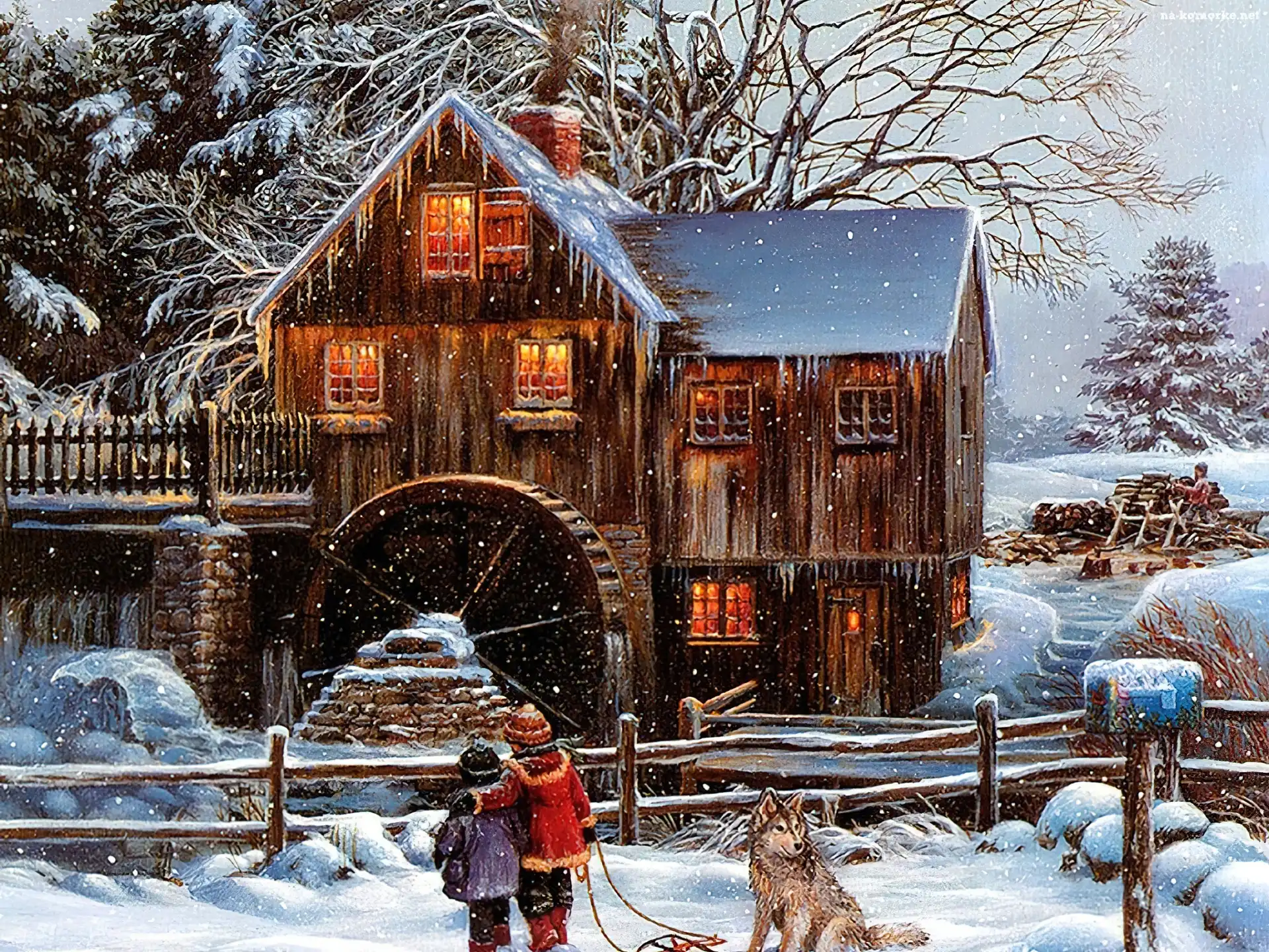 Zima, Młyn Wodny, Dzieci, Drewniany na Komórkę