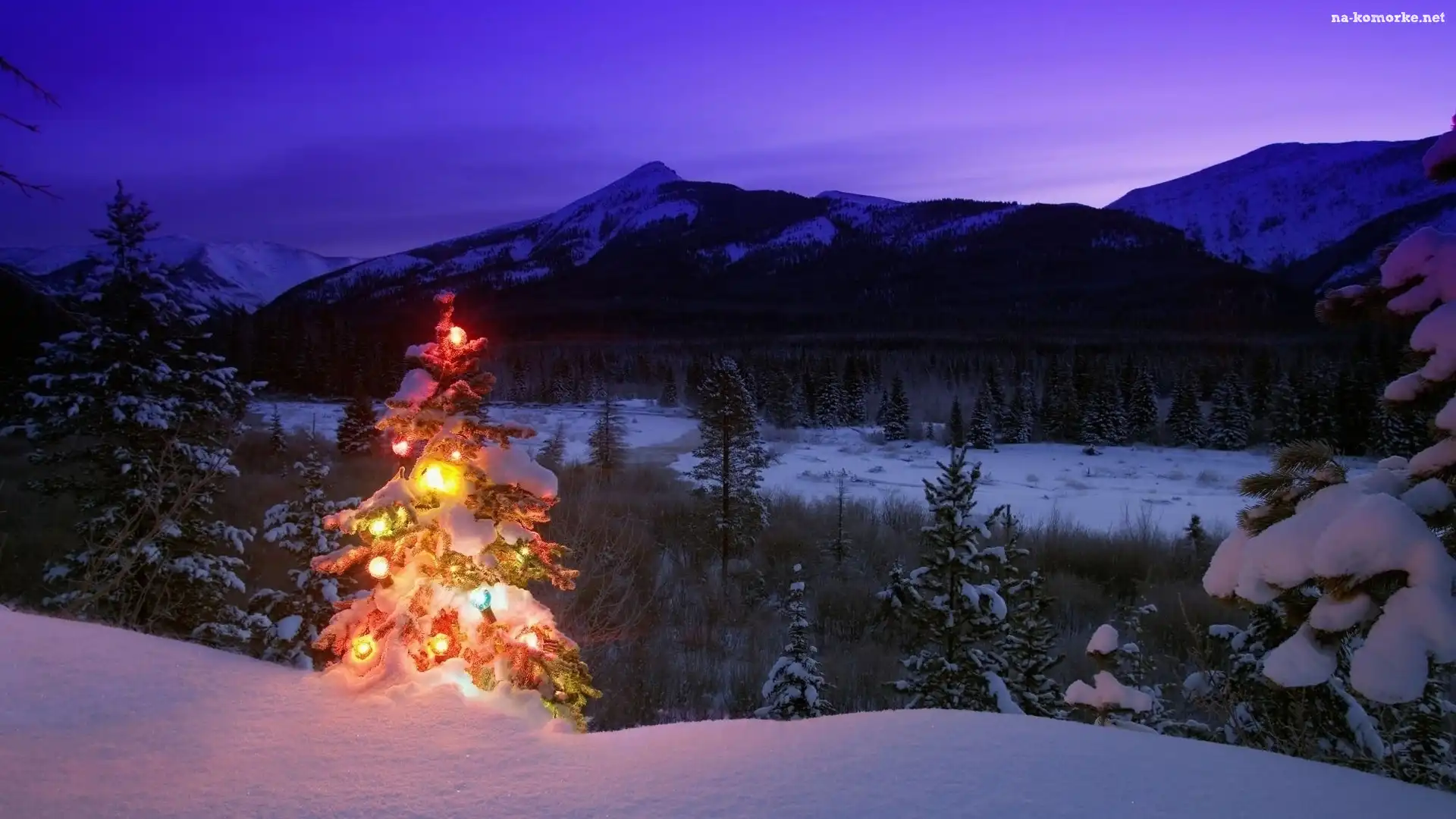Zima, Choinka, Góry, Oświetlona na Komórkę