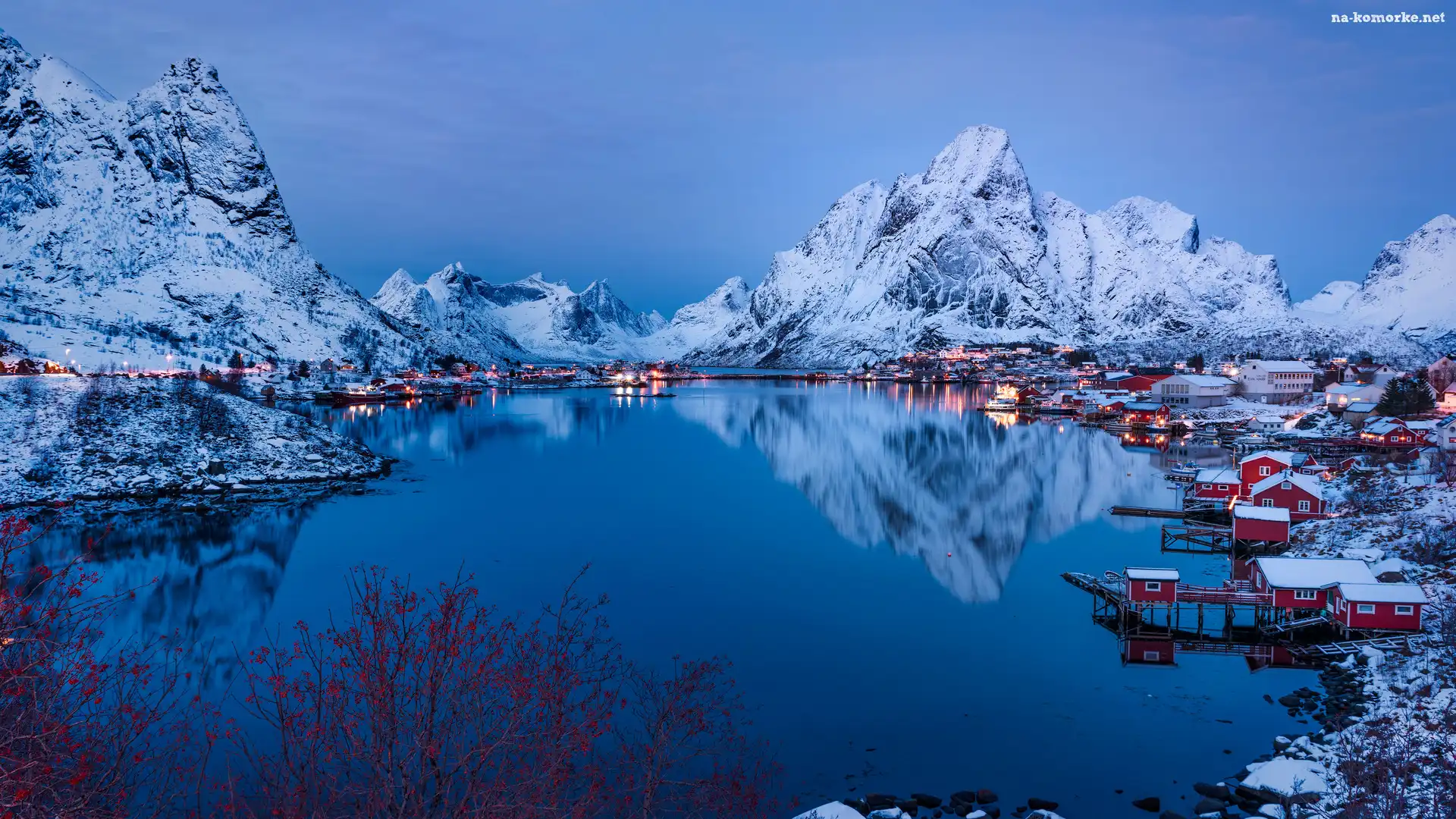 Morze Norweskie, Zima, Reine, Góry, Norwegia, Śnieg, Wyspa Moskenesoya, Domy, Lofoty na Komórkę