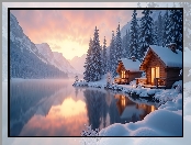 Domy, Ośnieżone, Góry, Zima, Drzewa, Drewniane, Jezioro na Komórkę