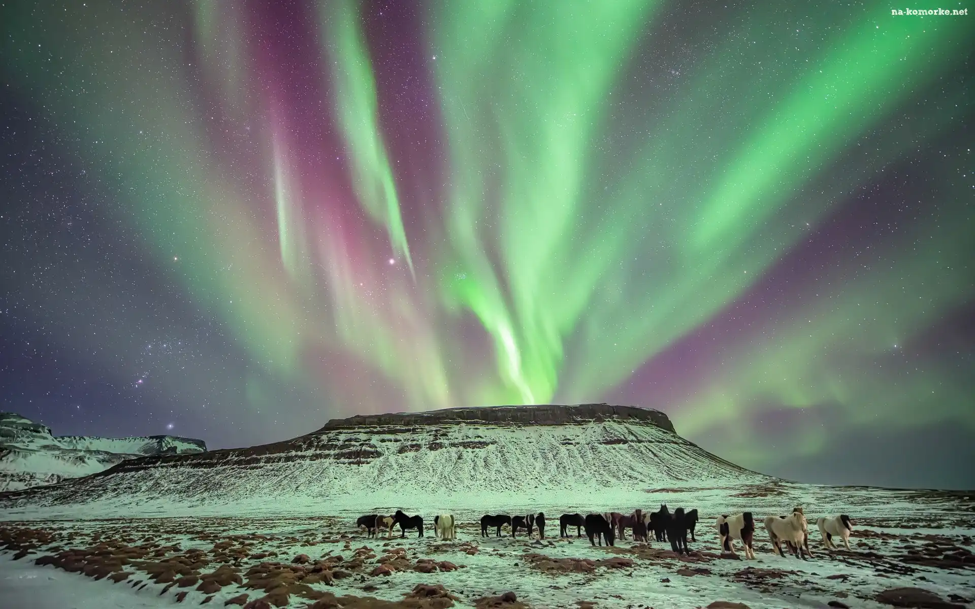 Zima, Zorza, Polarna, Góry, Konie na Komórkę