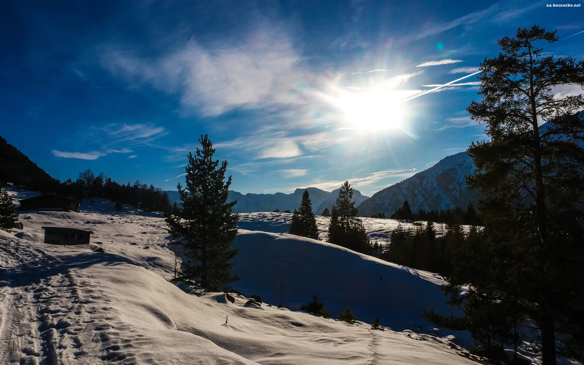 Zima, Promienie słońca, Góry, Drzewa na Komórkę