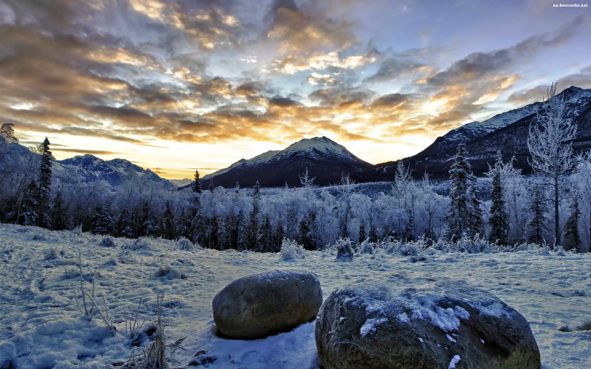 Zima, Zachód, Słońca, Góry, Las na Komórkę