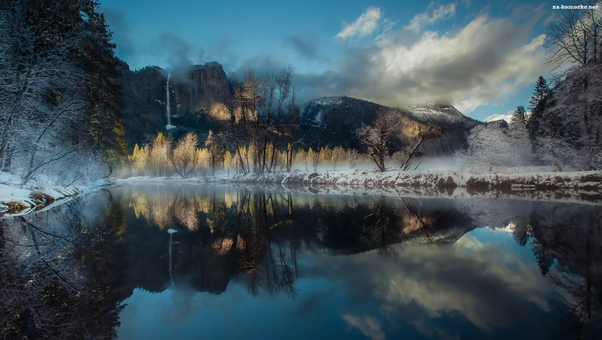 Zima, Chmury, Jezioro, Las na Komórkę
