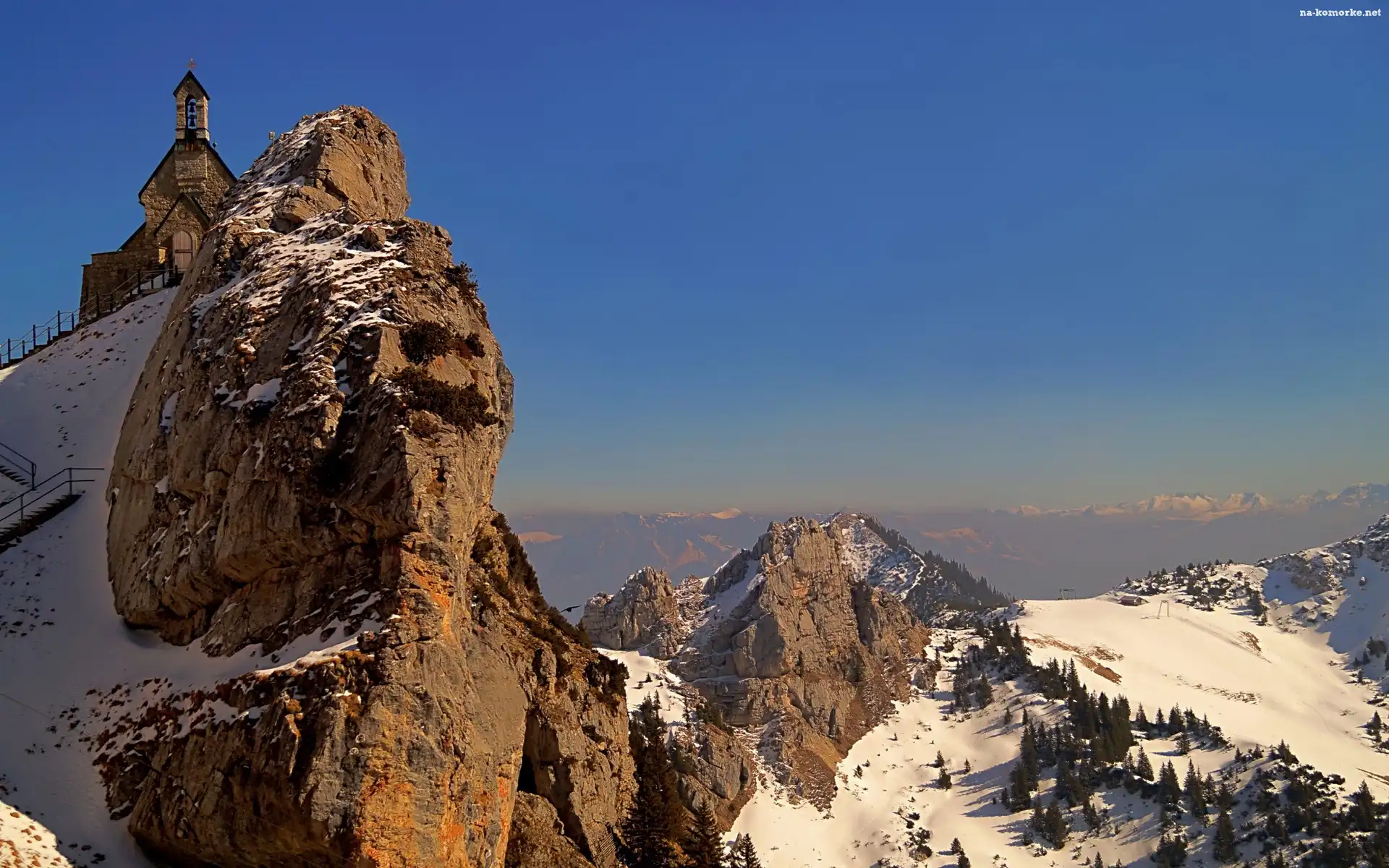 Zima, Góry, Skały, Kościół, Drzewa na Komórkę