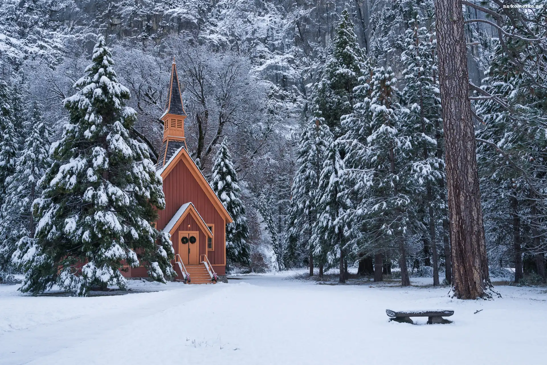 Kaplica, Zima, Las, Kościółek, Stany Zjednoczone, Drzewa, Stan Kalifornia, Ławeczka, Park Narodowy Yosemite na Komórkę |