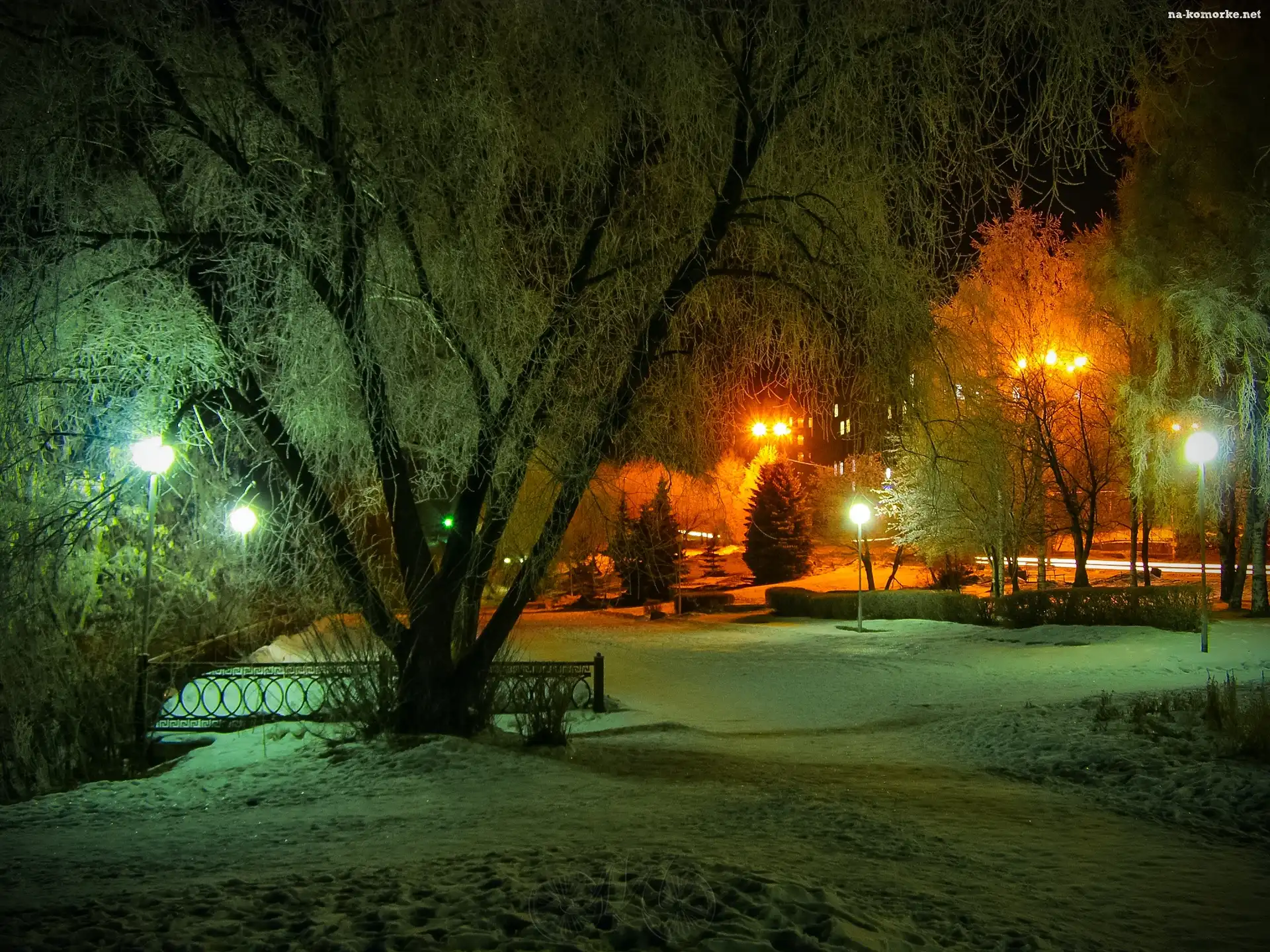 Zima, Park, Drzewa, Lampy, Noc na Komórkę