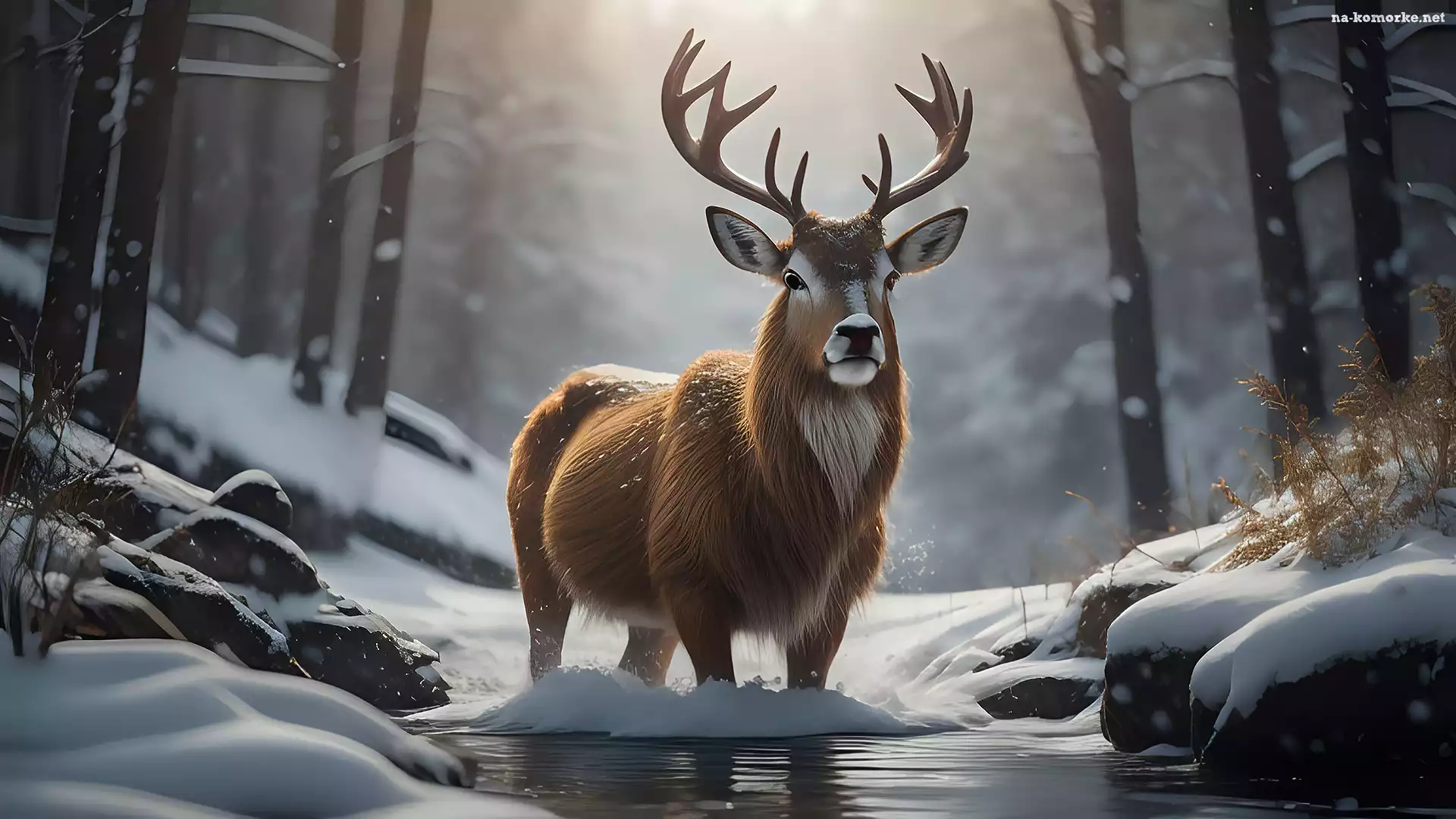 Jeleń, Zima, Las, Woda, 2D na Komórkę