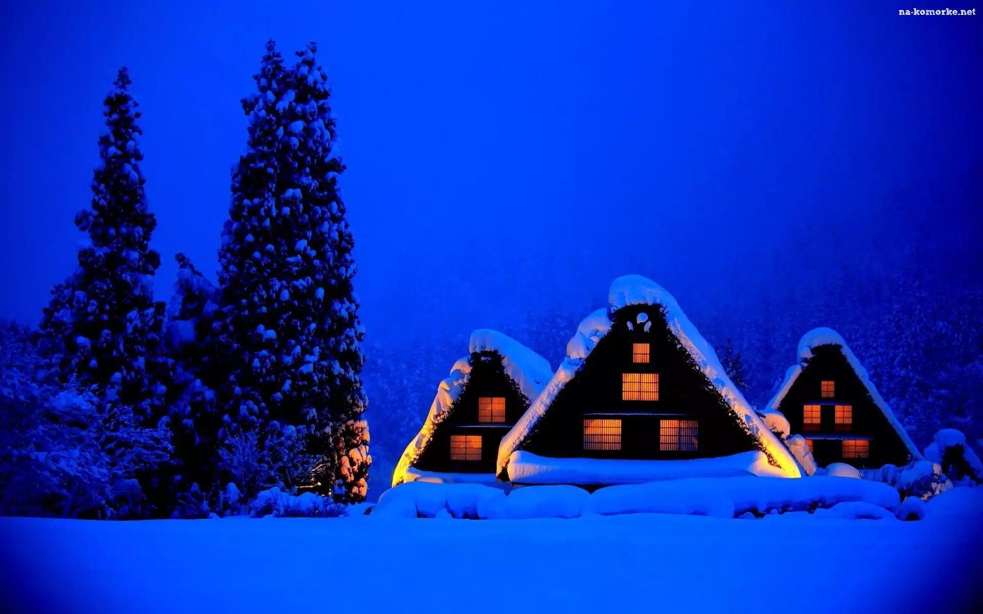 Zima, Oświetlone, Domy, Las, Noc na Komórkę
