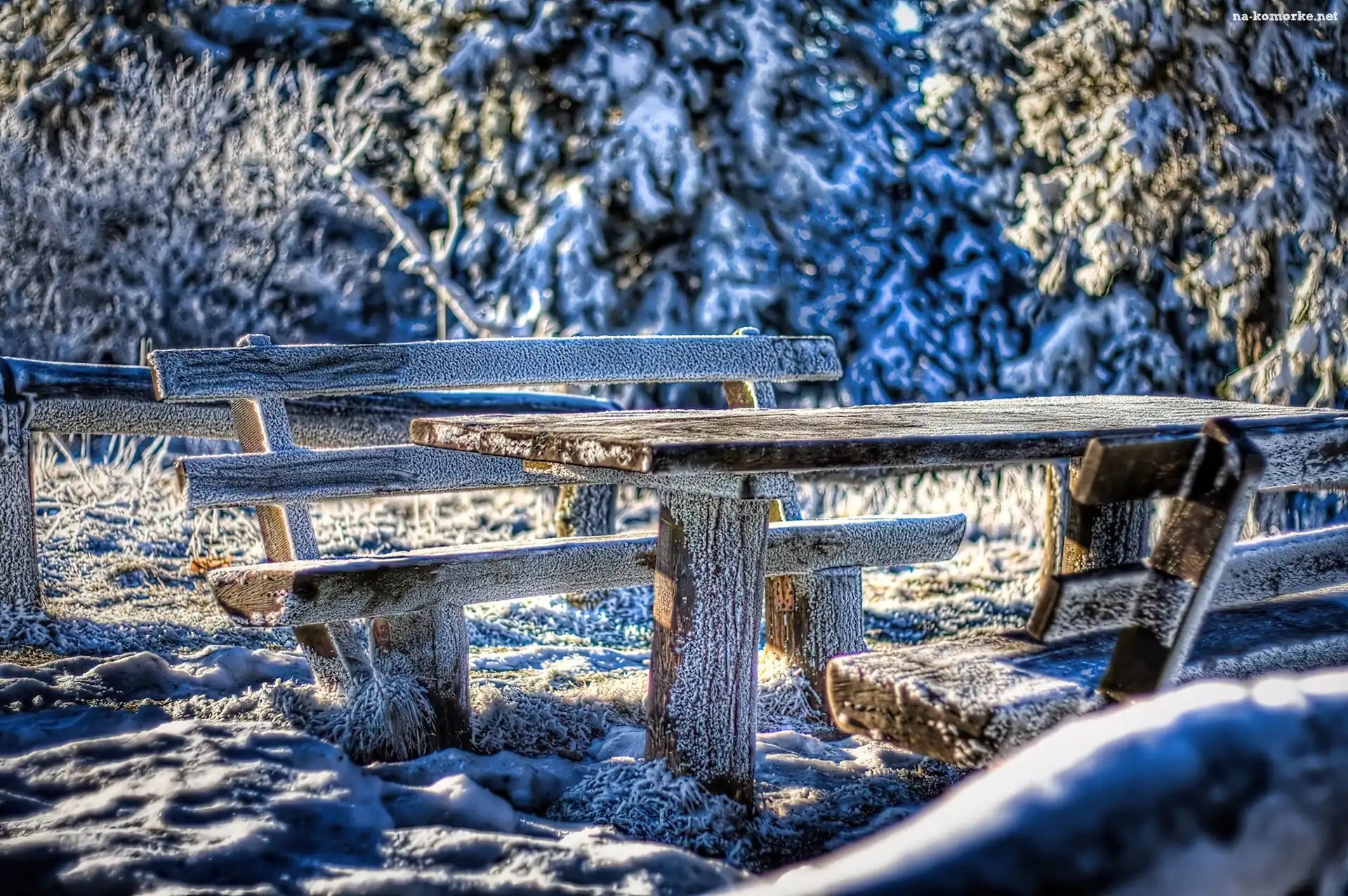 Zima, Oszronione, Ławki, Śnieg, Drzewa na Komórkę