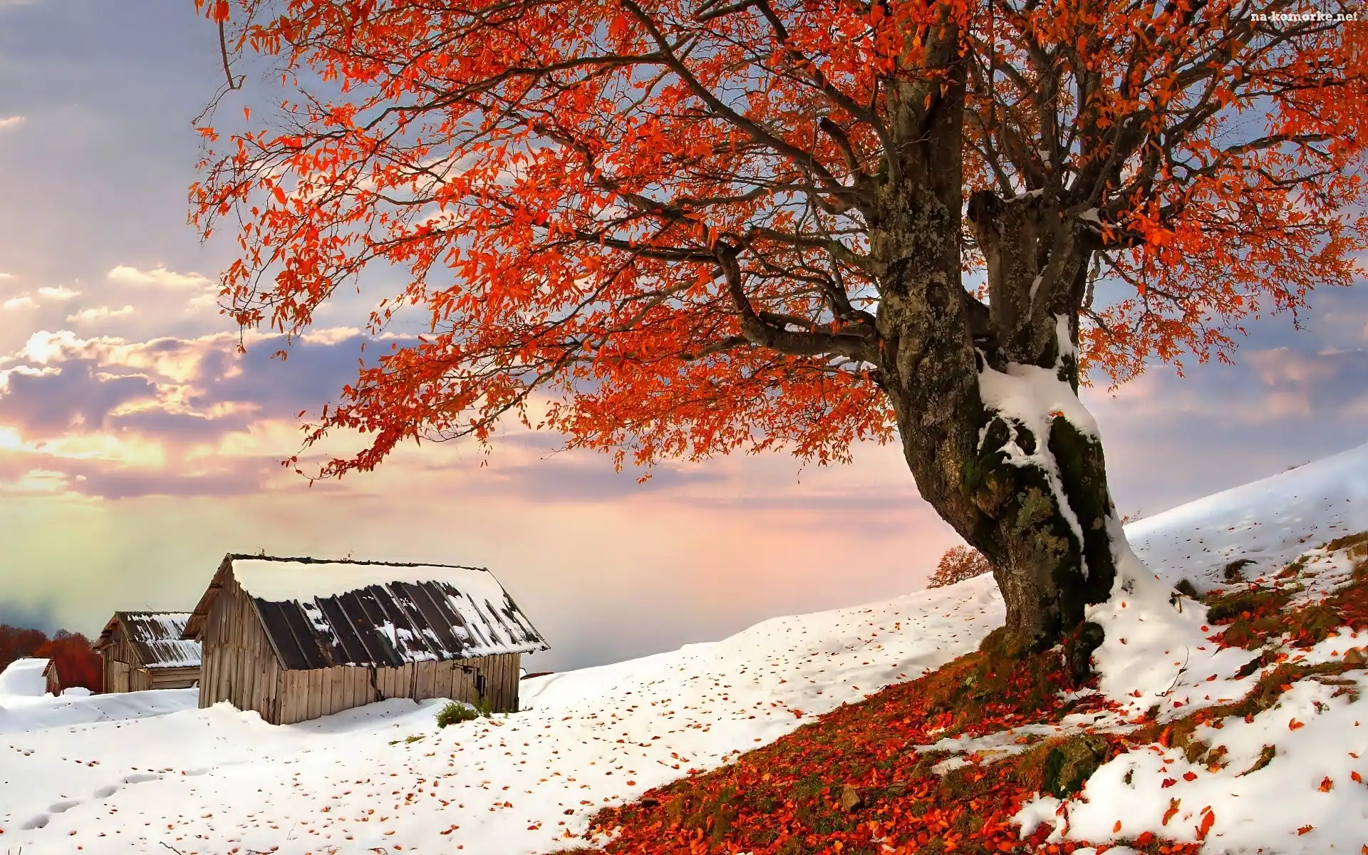 Zima, Domki, Śnieg, Drzewo na Komórkę