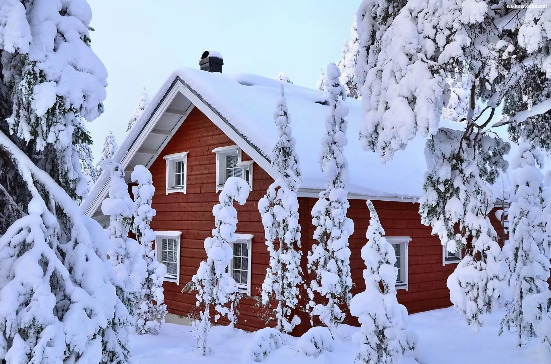 Zima, Dom, Ośnieżone, Drzewa na Komórkę