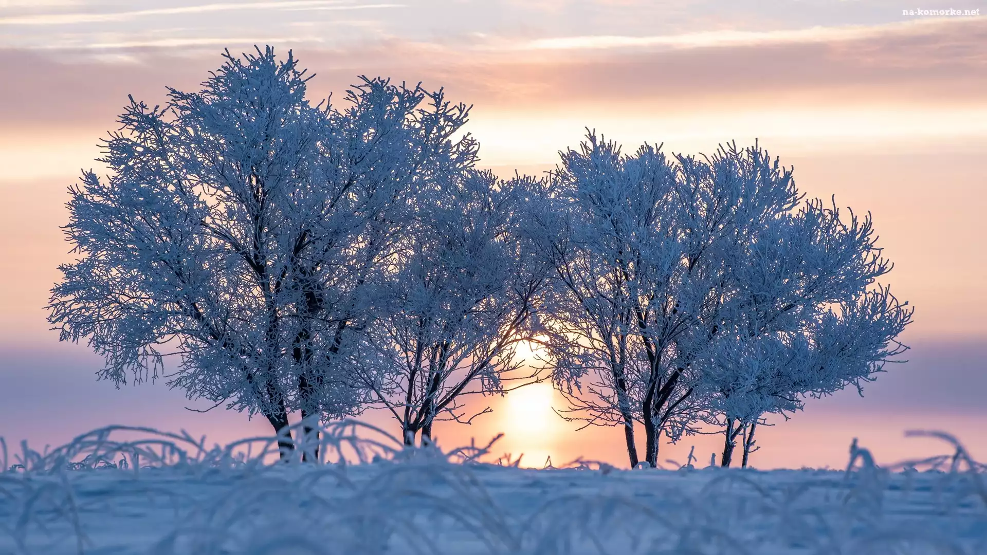 Zima, Wschód słońca, Oszronione, Drzewa na Komórkę
