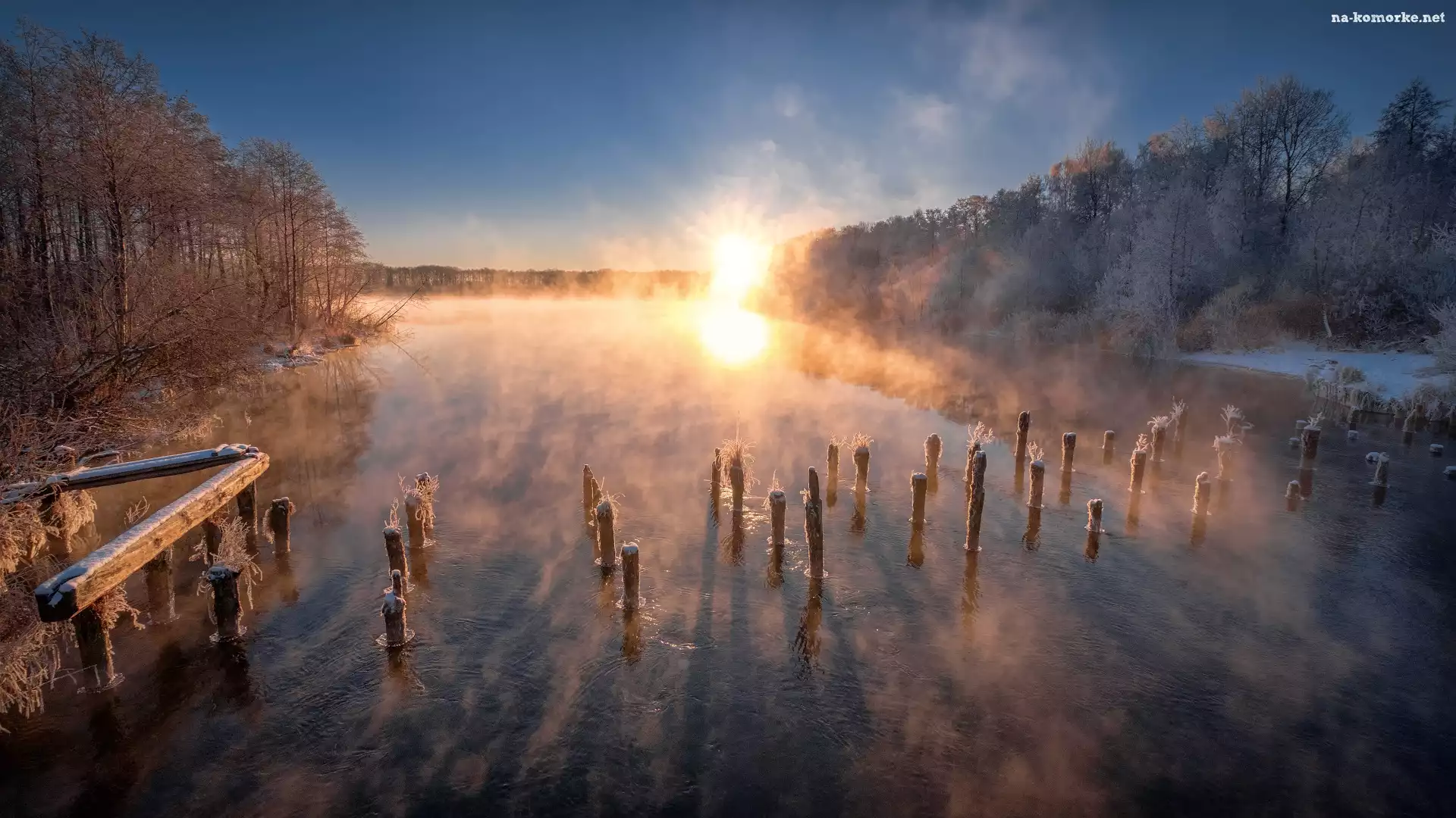 Zima, Wschód słońca, Rosja, Mgła, Obwód moskiewski, Szatura, Jezioro Białe, Oszronione, Drzewa, Kołki na Komórkę |