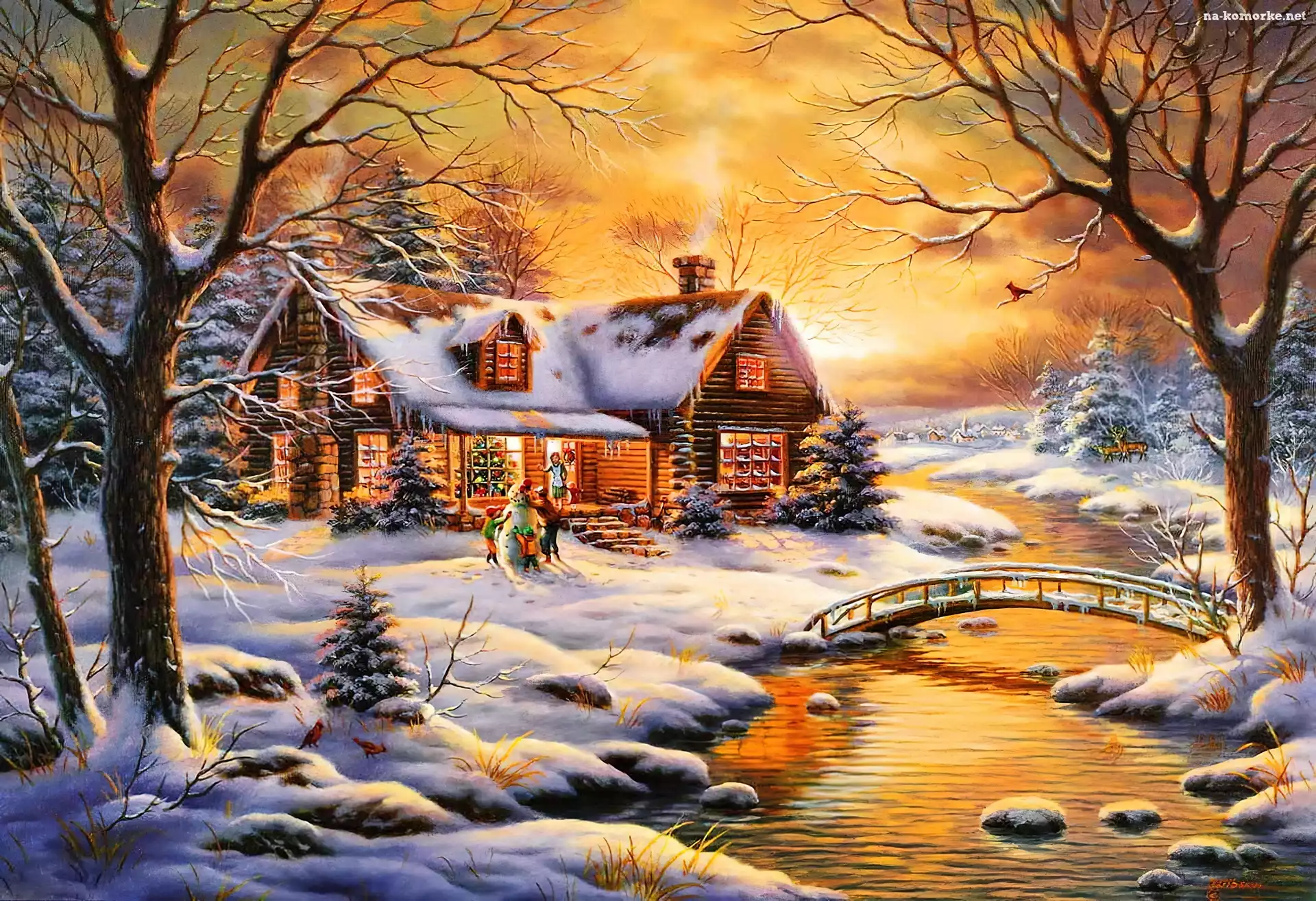 Zima, Zachód, Słońca, Rzeczka, Domek na Komórkę