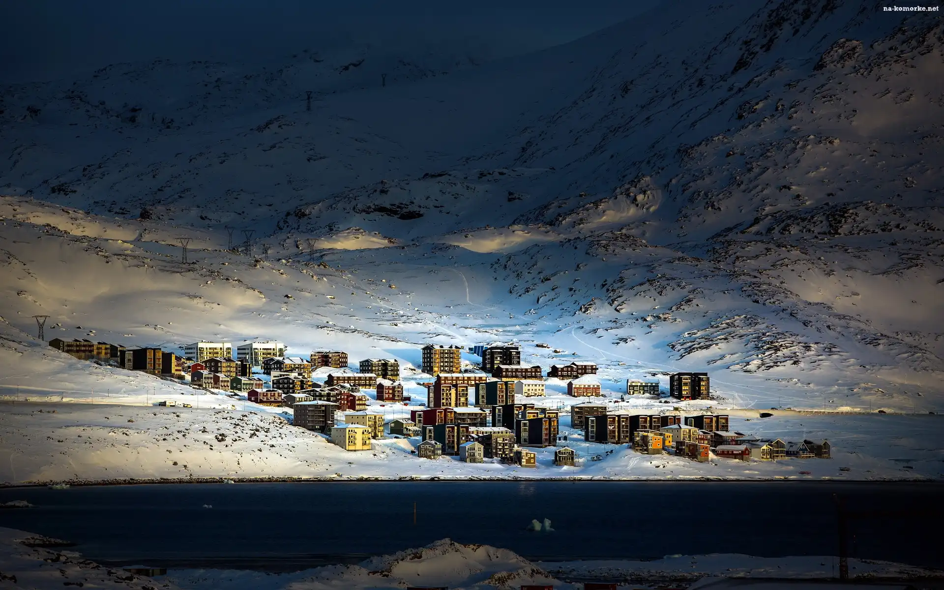 Zima, Miasteczko, Góry, Rzeka, Noc na Komórkę