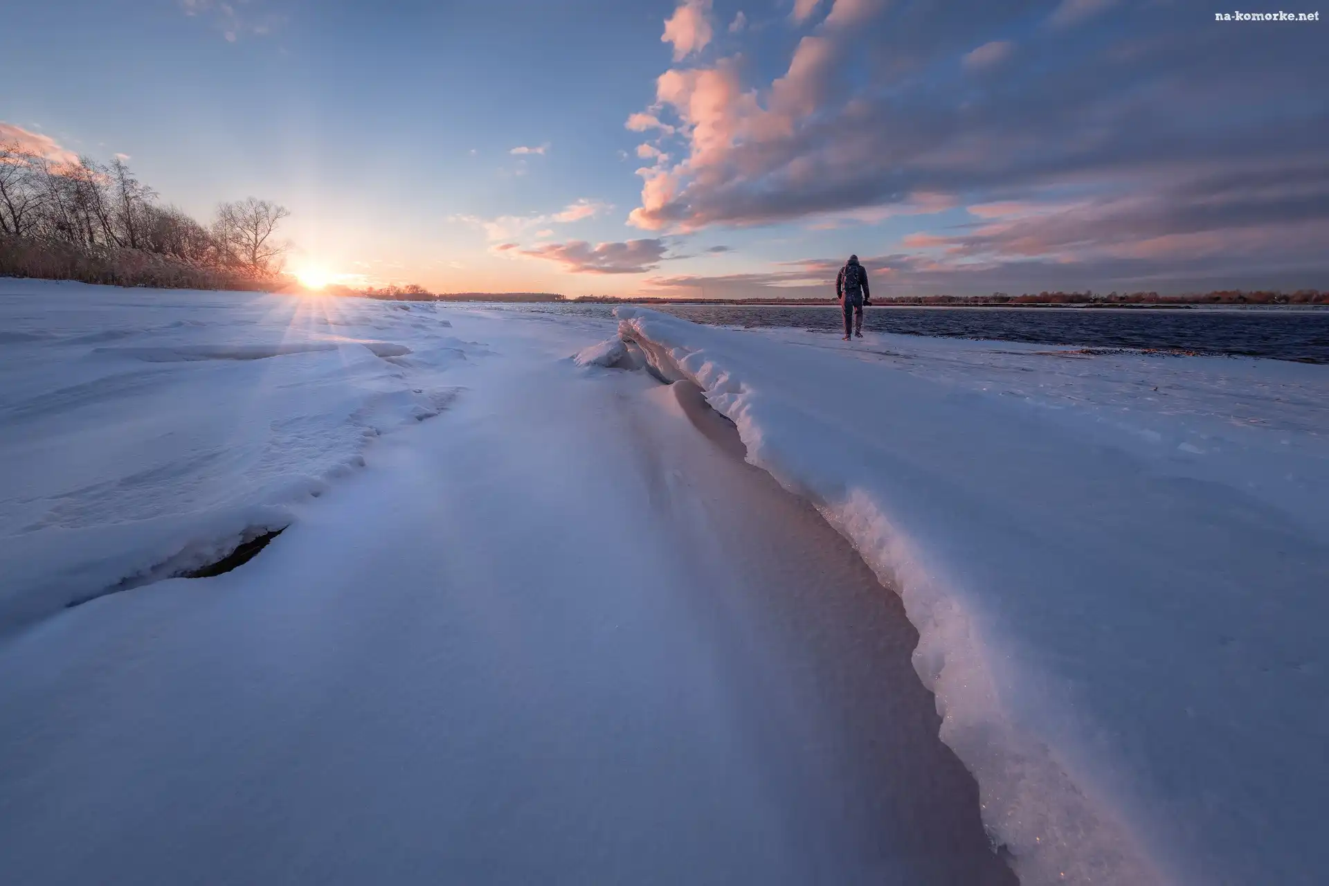 Zima, Słońce, Rosja, Rzeka Wołga, Obwód moskiewski, Miejscowość Dubna, Mężczyzna, Śnieg, Niebo, Chmury na Komórkę |