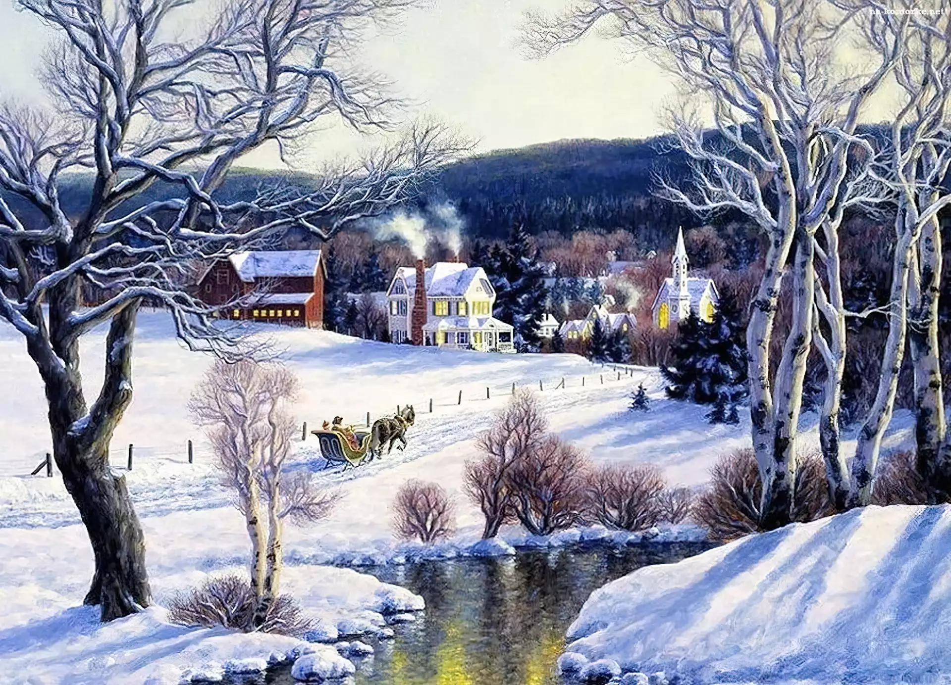 Zima, Rzeka, Droga, Sanie, Drzewa na Komórkę