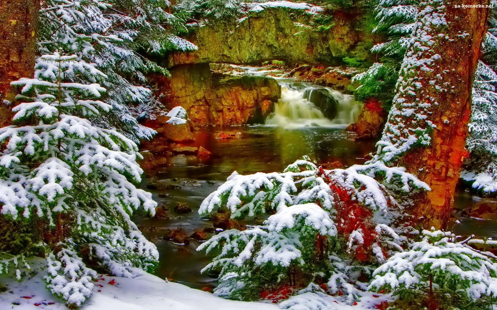 Zima, Rzeczka, Las, Skały, Drzewa na Komórkę