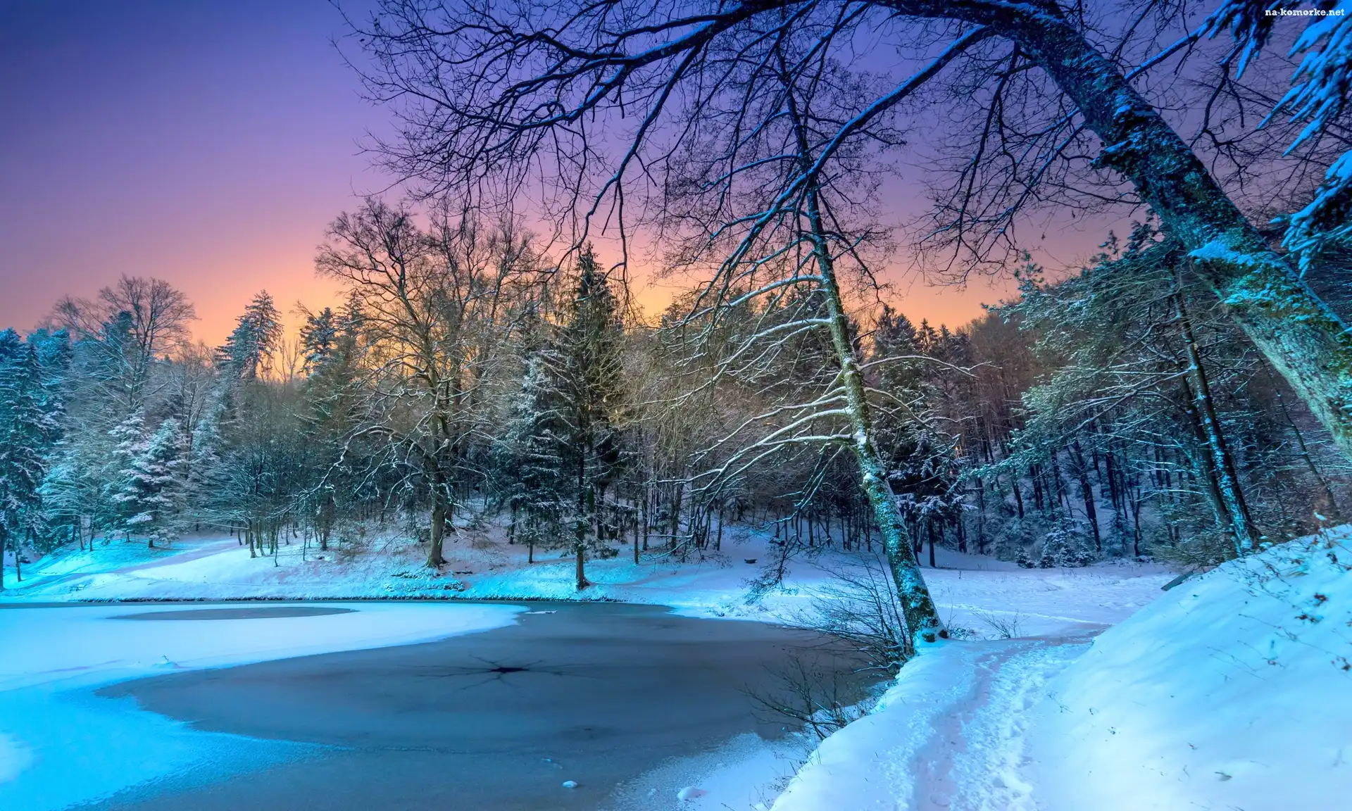 Zima, Staw, Ścieżka, Zachód słońca, Las na Komórkę
