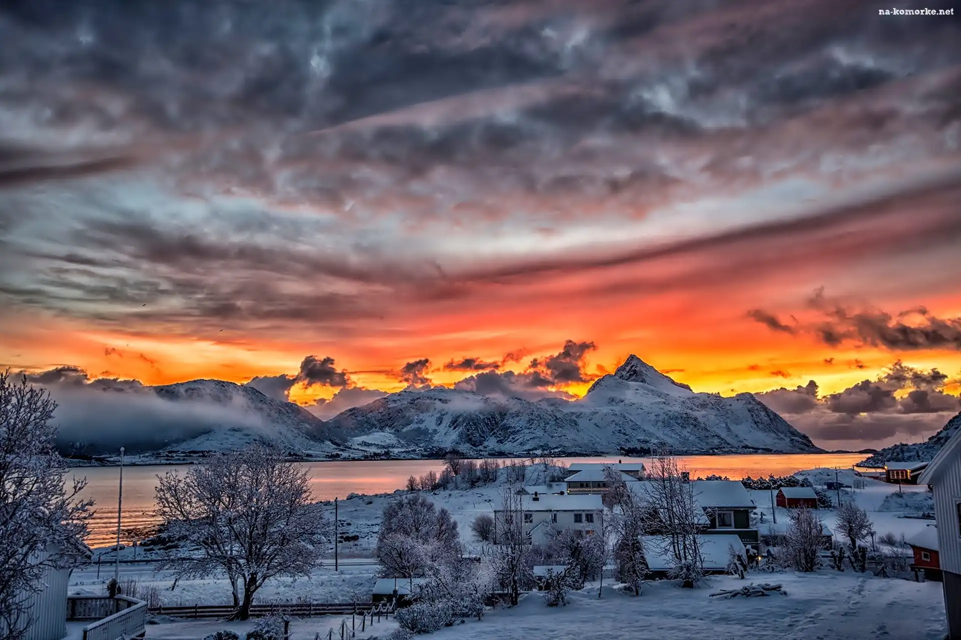 Zima, Wieś, Zachód Słońca, Domy na Komórkę