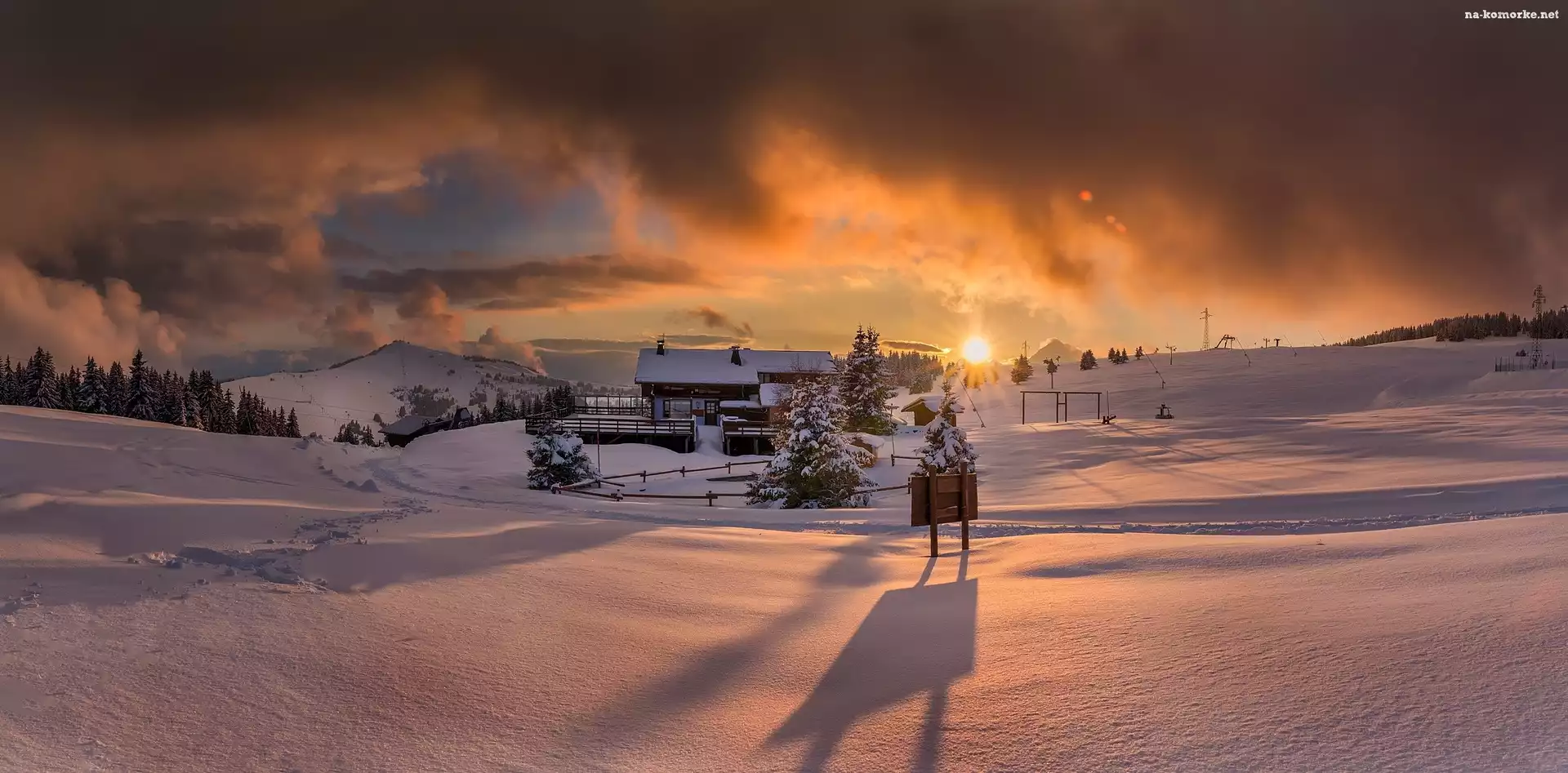 Zima, Wzgórza, Zachód słońca, Dom na Komórkę