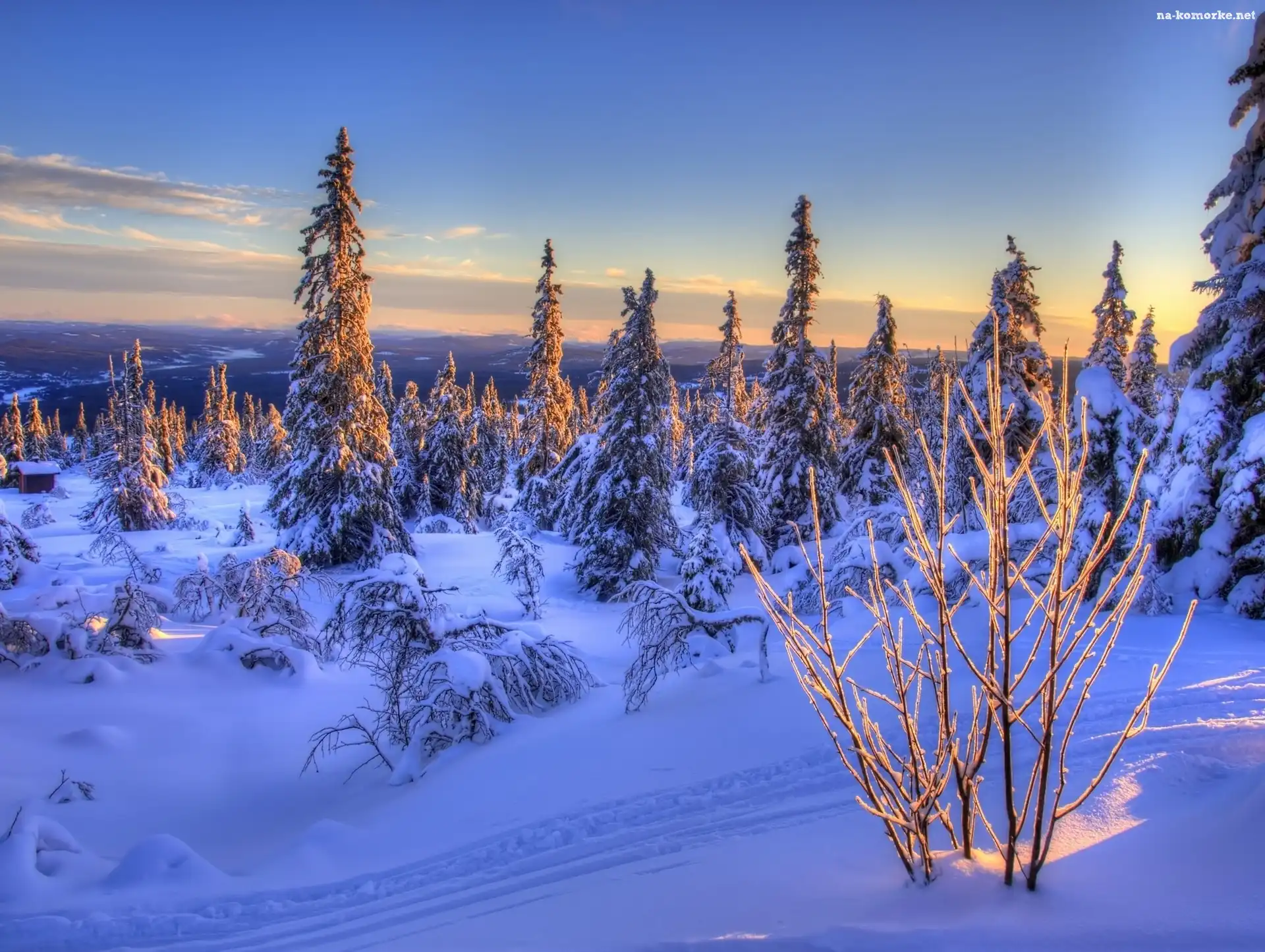 Zima, Zachód, Słońca, Świerki, Góry na Komórkę