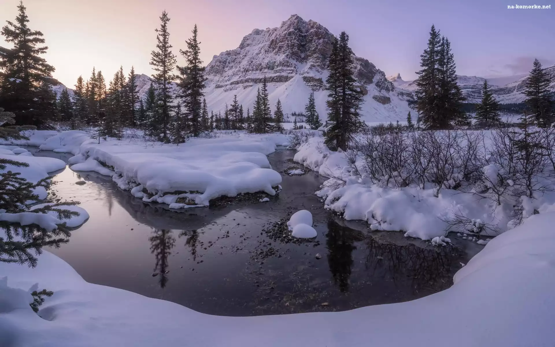 Park Narodowy Banff, Drzewa, Jezioro, Kanada, Zima, Wschód słońca, Góry, Alberta na Komórkę