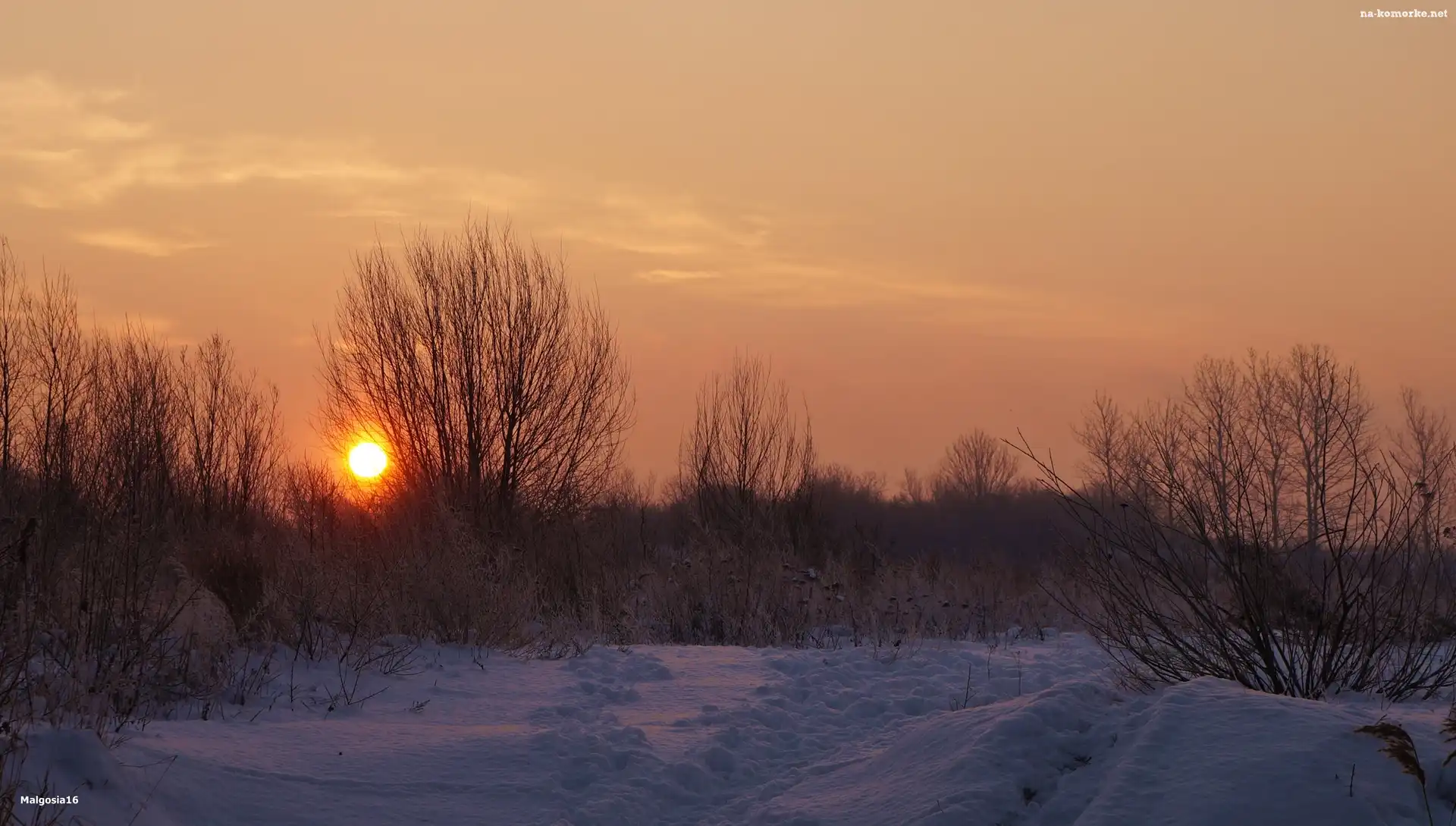 Zima, Drzewa, Śnieg, Wschód Słońca na Komórkę