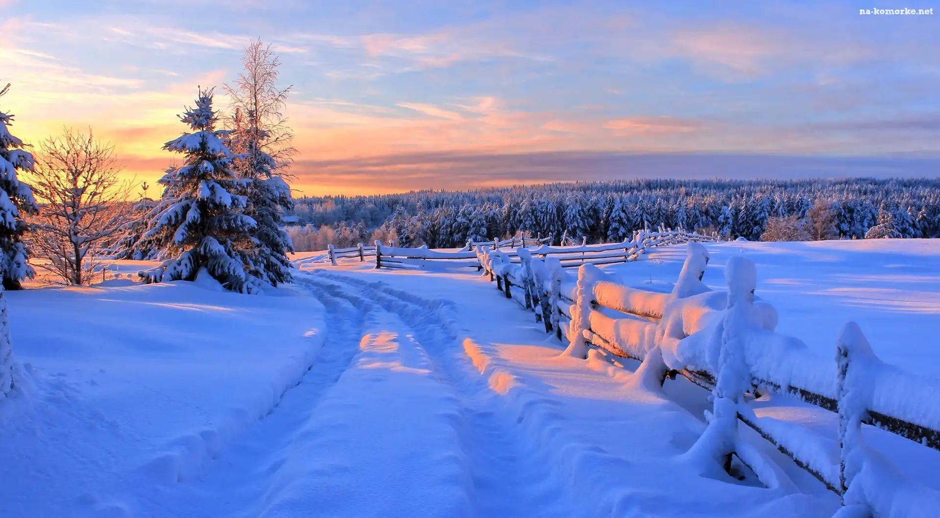 Zima, Świerki, Ogrodzenie, Wschód słońca na Komórkę