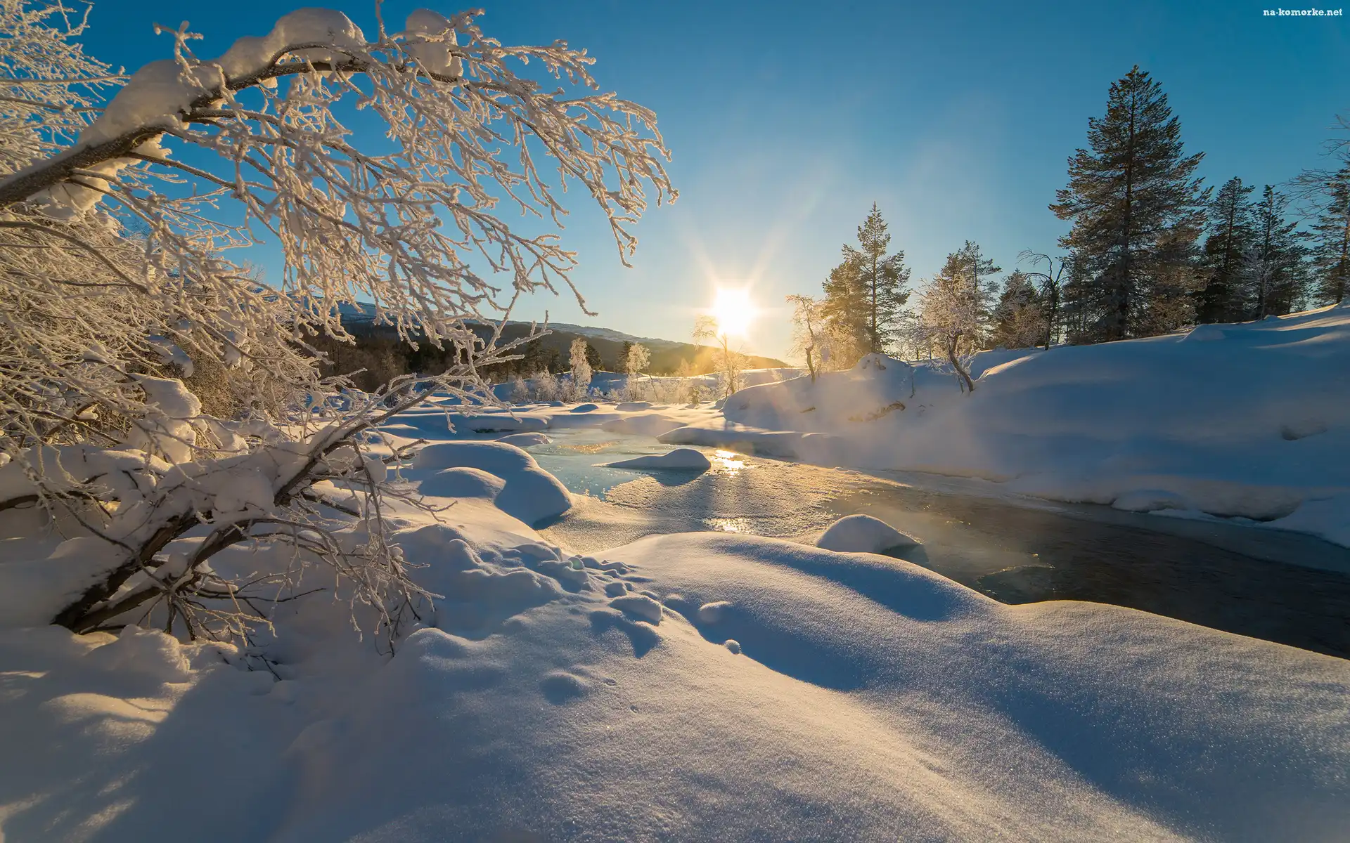 Zima, Drzewa, Rzeka, Wschód słońca na Komórkę