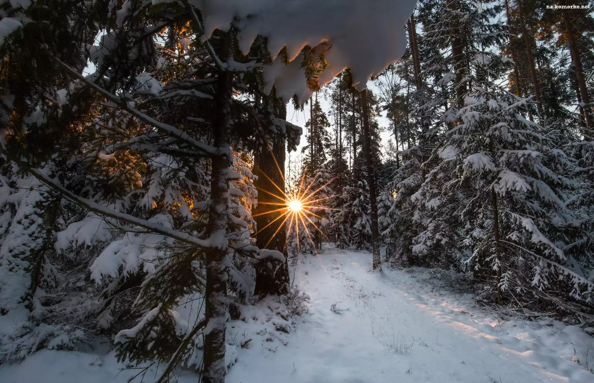 Zima, Promienie słońca, Las, Wschód słońca na Komórkę